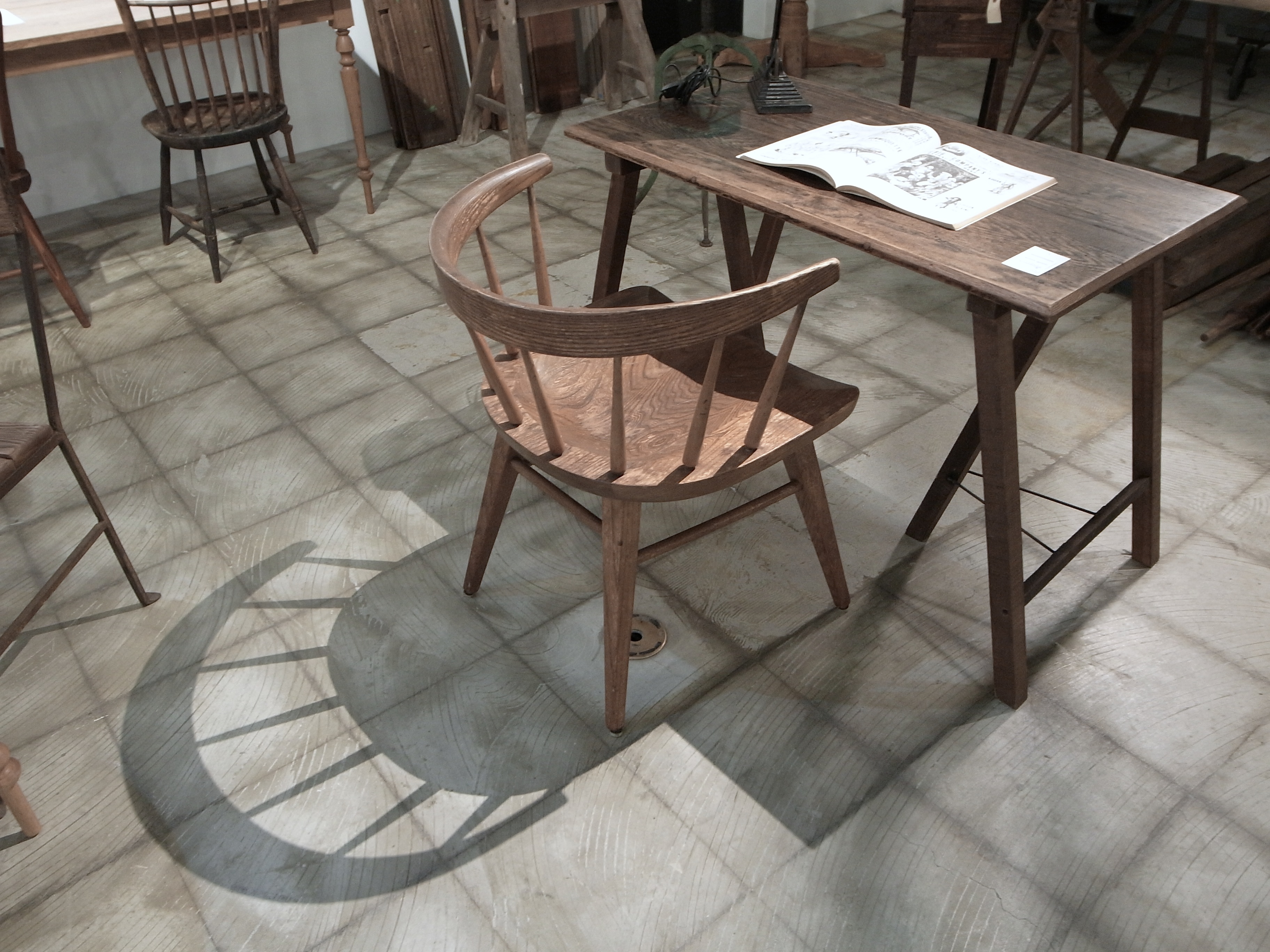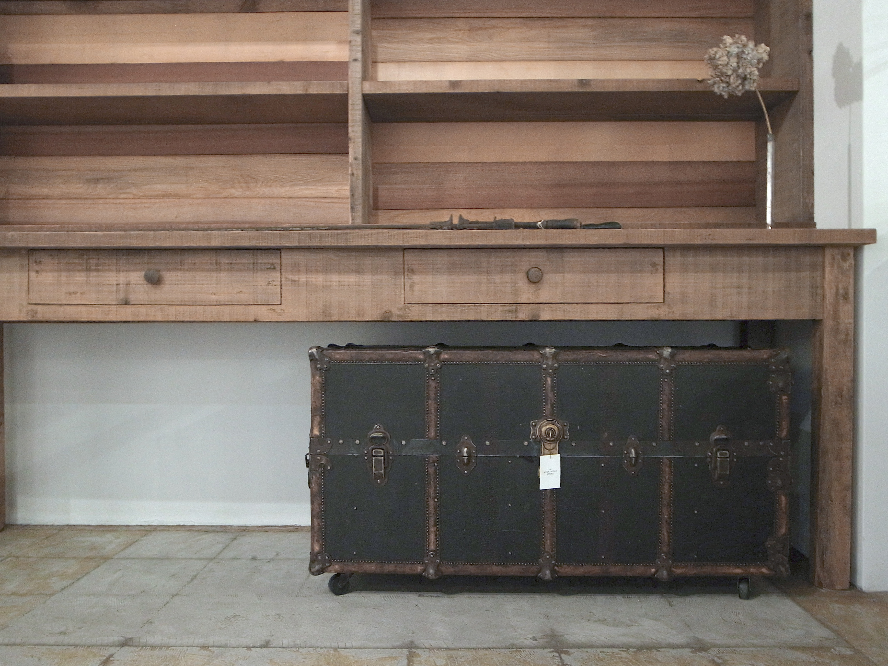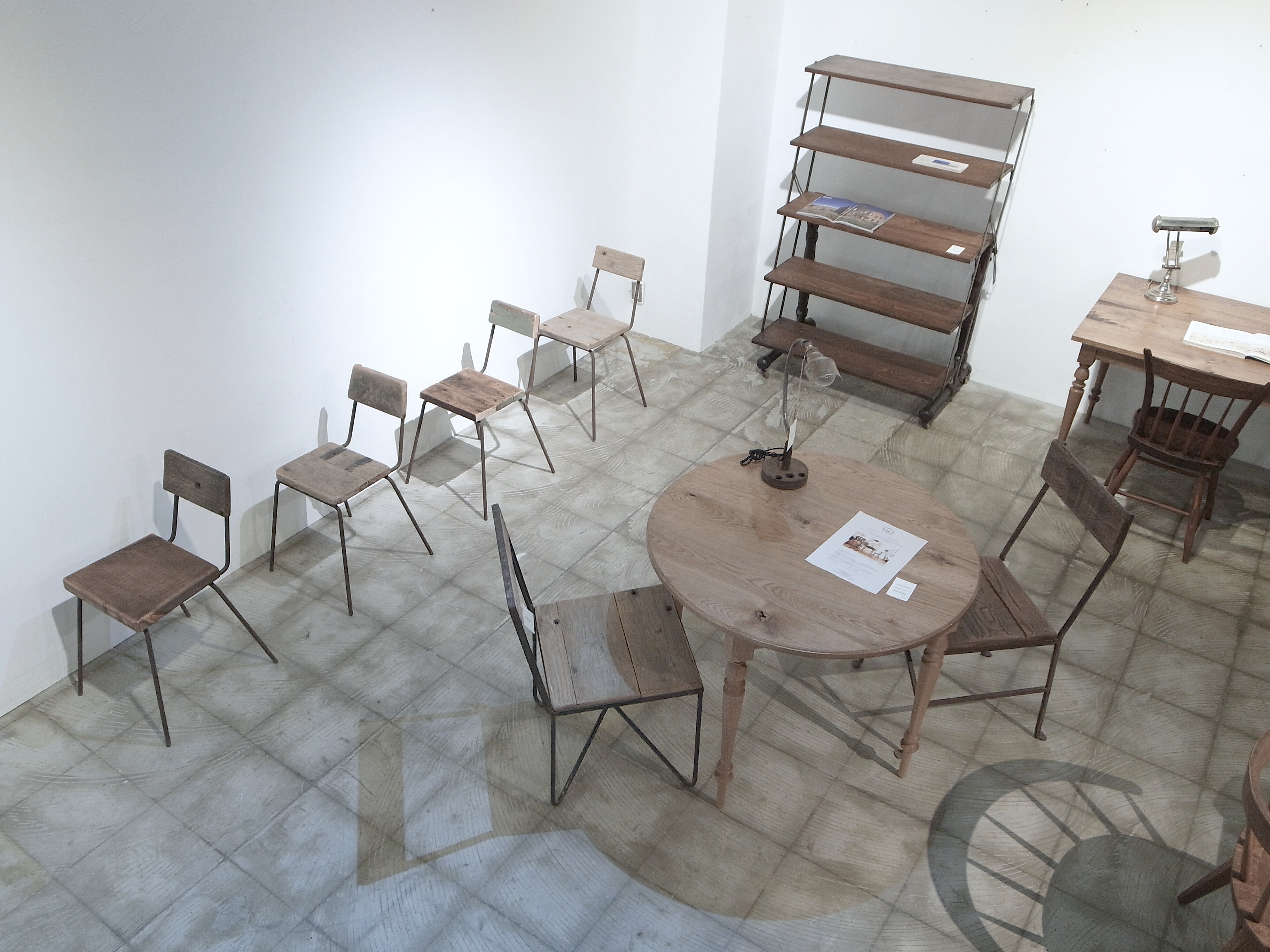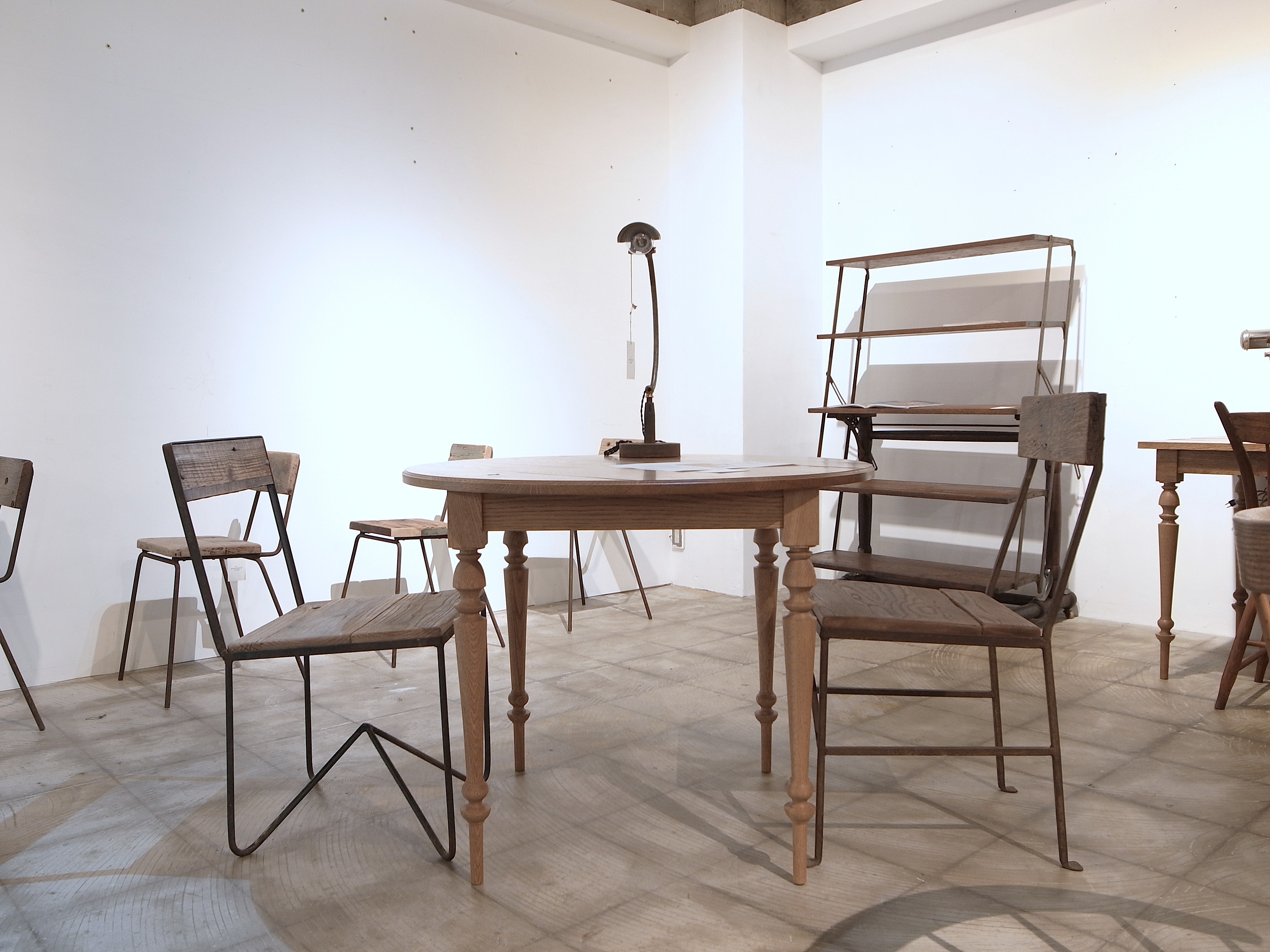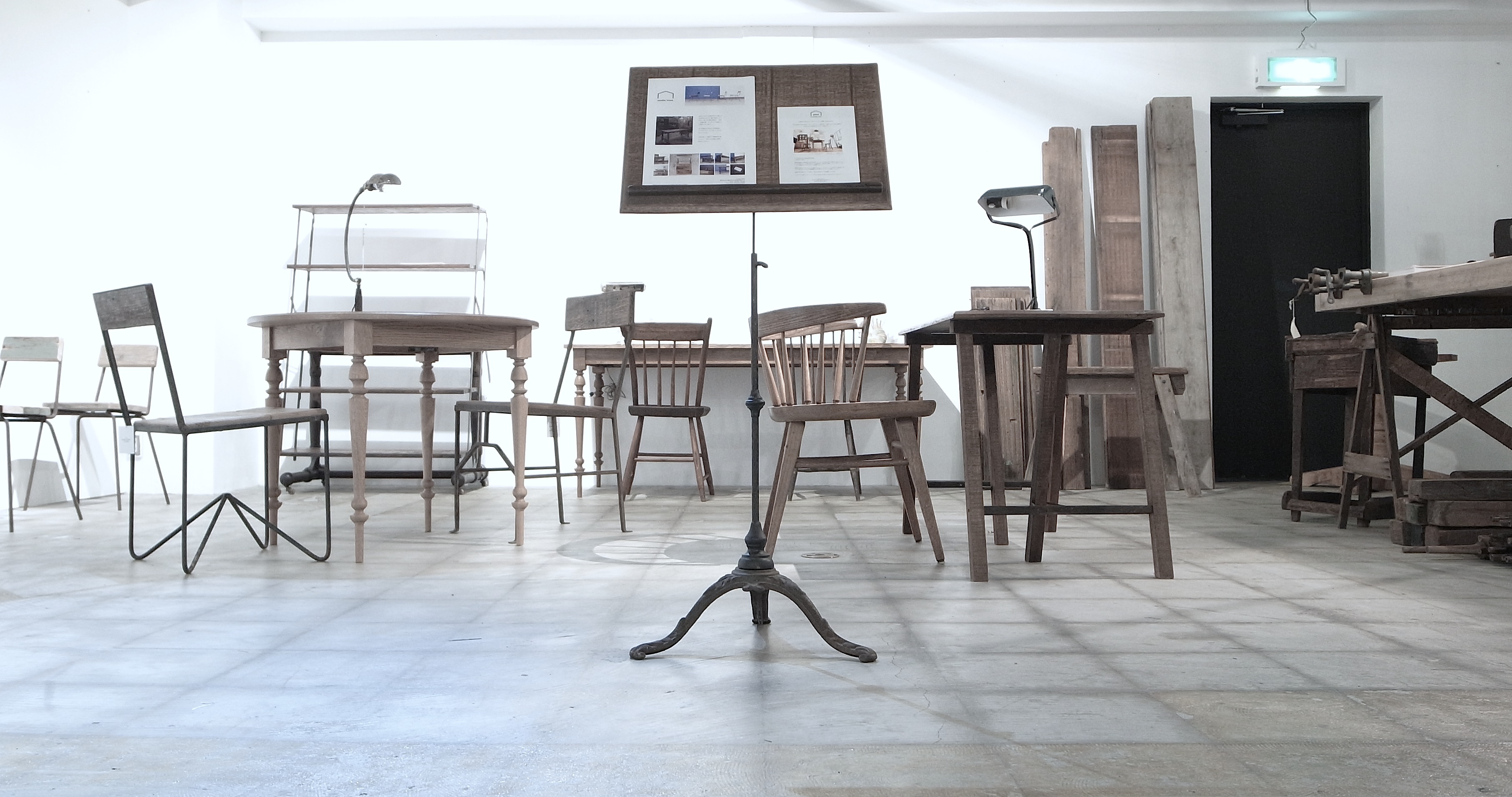 古材、古物を使用し製作した家具、店舗什器、インテリア小物、studio trussのコラボレーション企画『plus truss』の商品や、天板を製作する過程で行わせる接ぎの作業風景等がディスプレイされています。