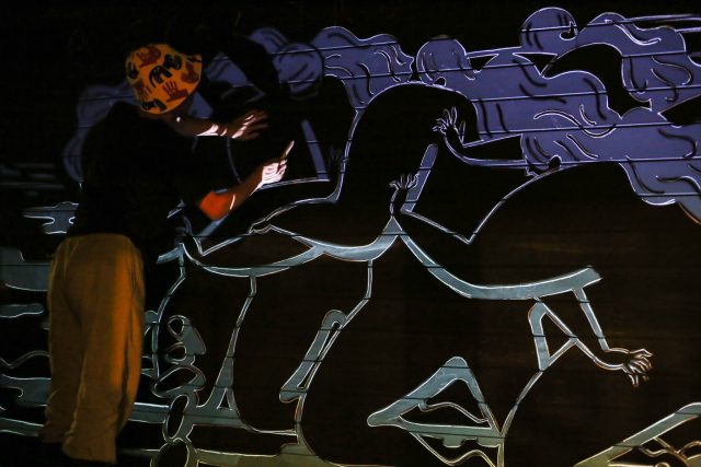 最初はただ真っ黒な大きな壁だったトラックの外装に、スラスラと絵が現れていく不思議な光景でした。