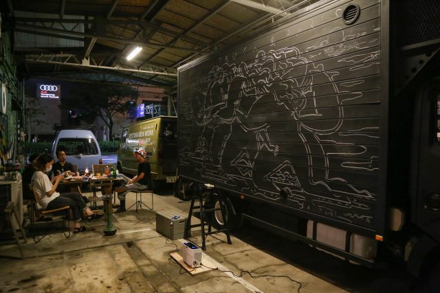 現在は名古屋久屋大通、テレビ塔のある公園「Hisaya-odori Park」内にあるトラック型店舗、「SOCIAL TRUCK & PARKS」の顔となる、外装のドローイングと、内装のディスプレイ装飾の作業です。