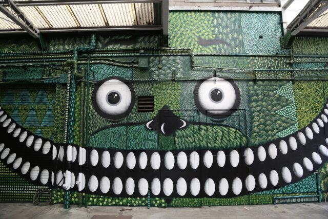 駐車スペースに描かれた緑色のモンスターの壁画が目印の建物です。