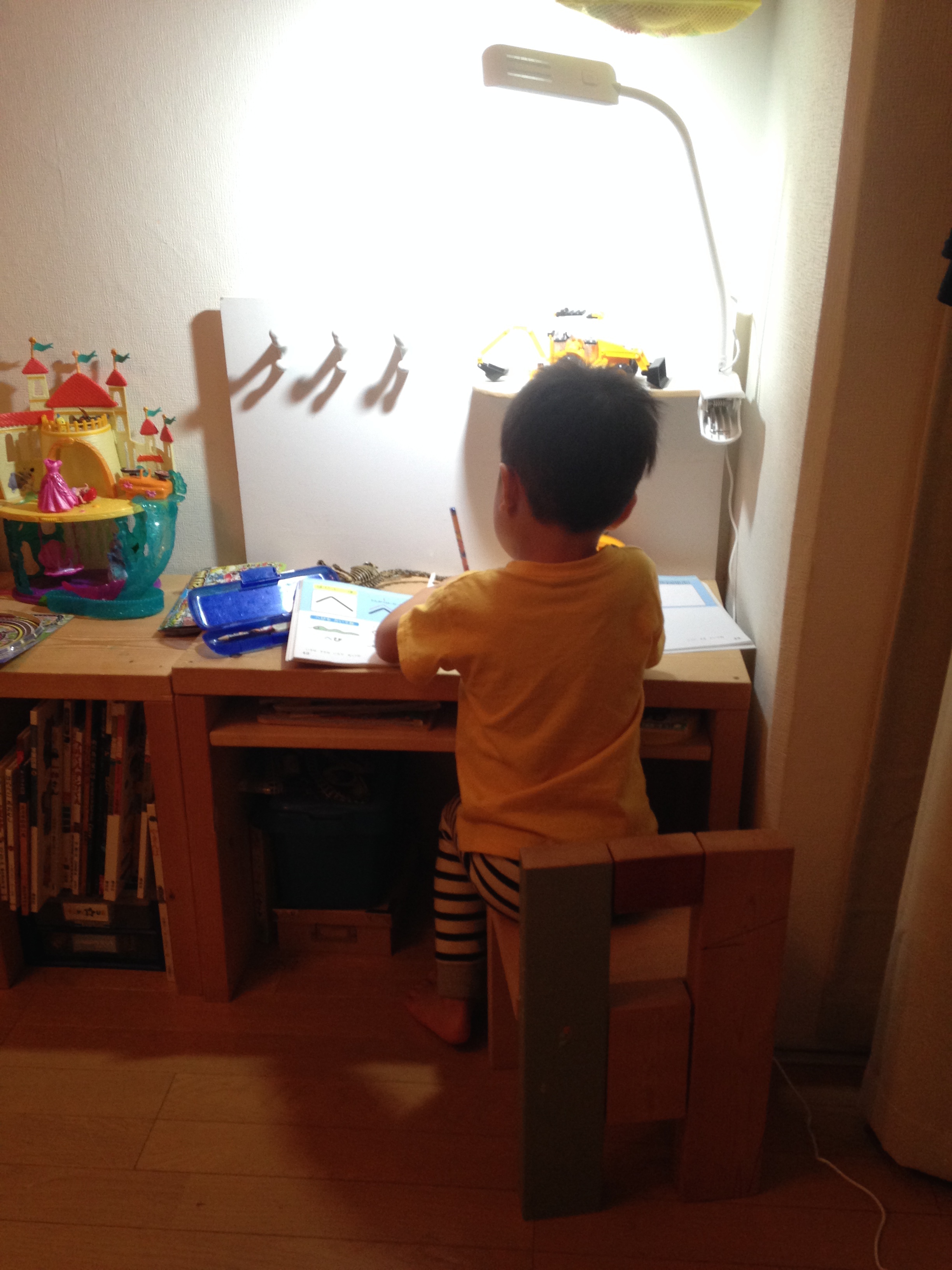 自宅のおもちゃを整理する棚を、勉強机に少しだけ作り替えたところで、、、