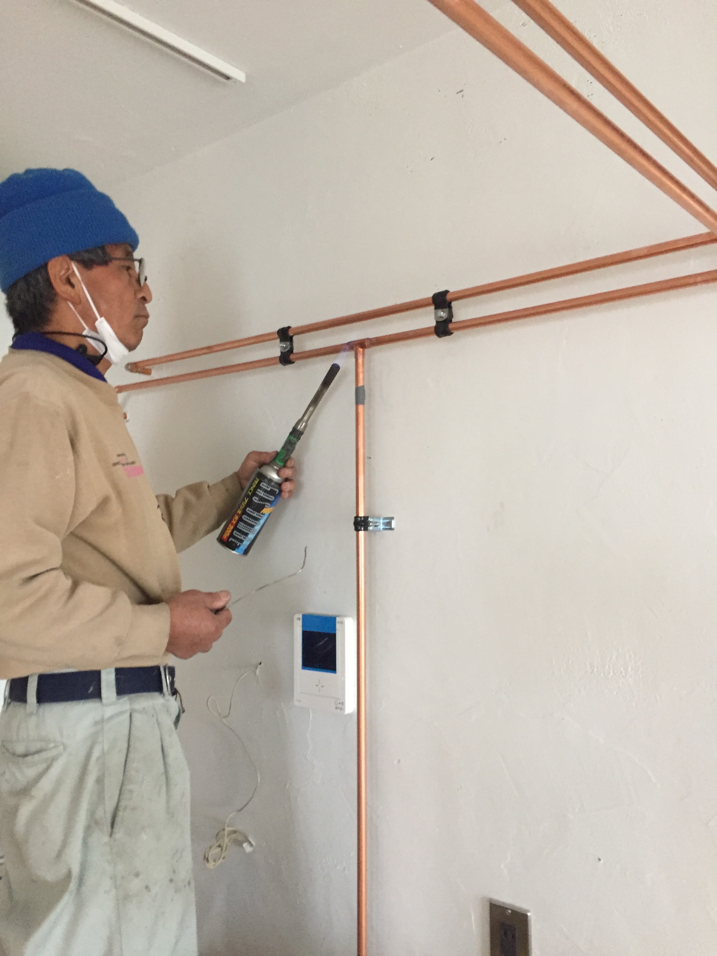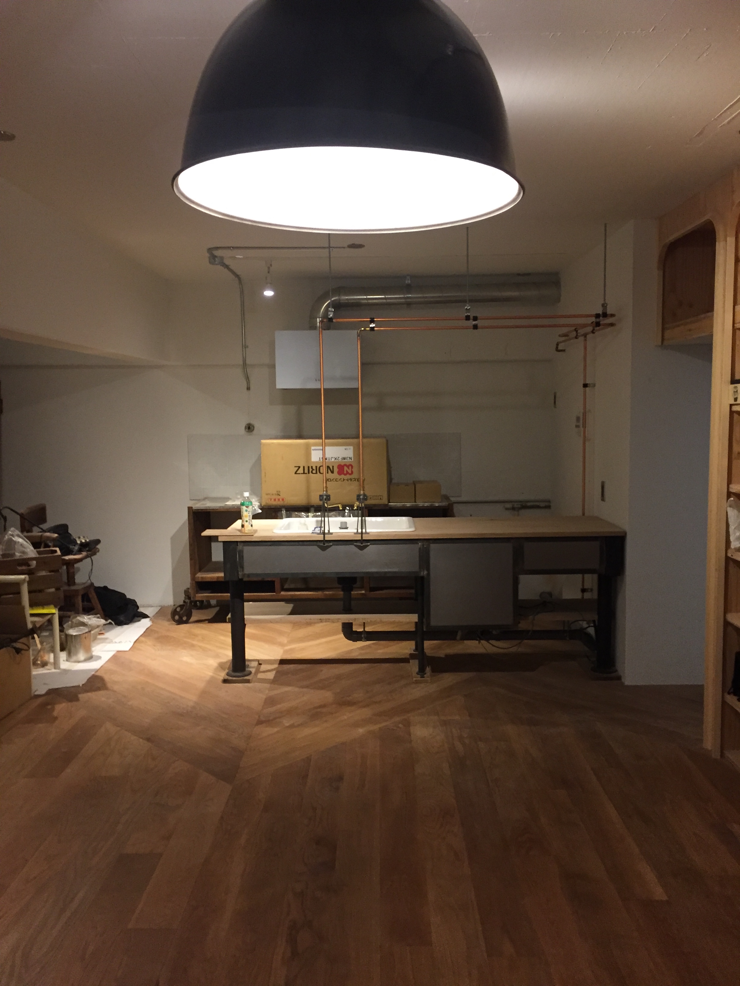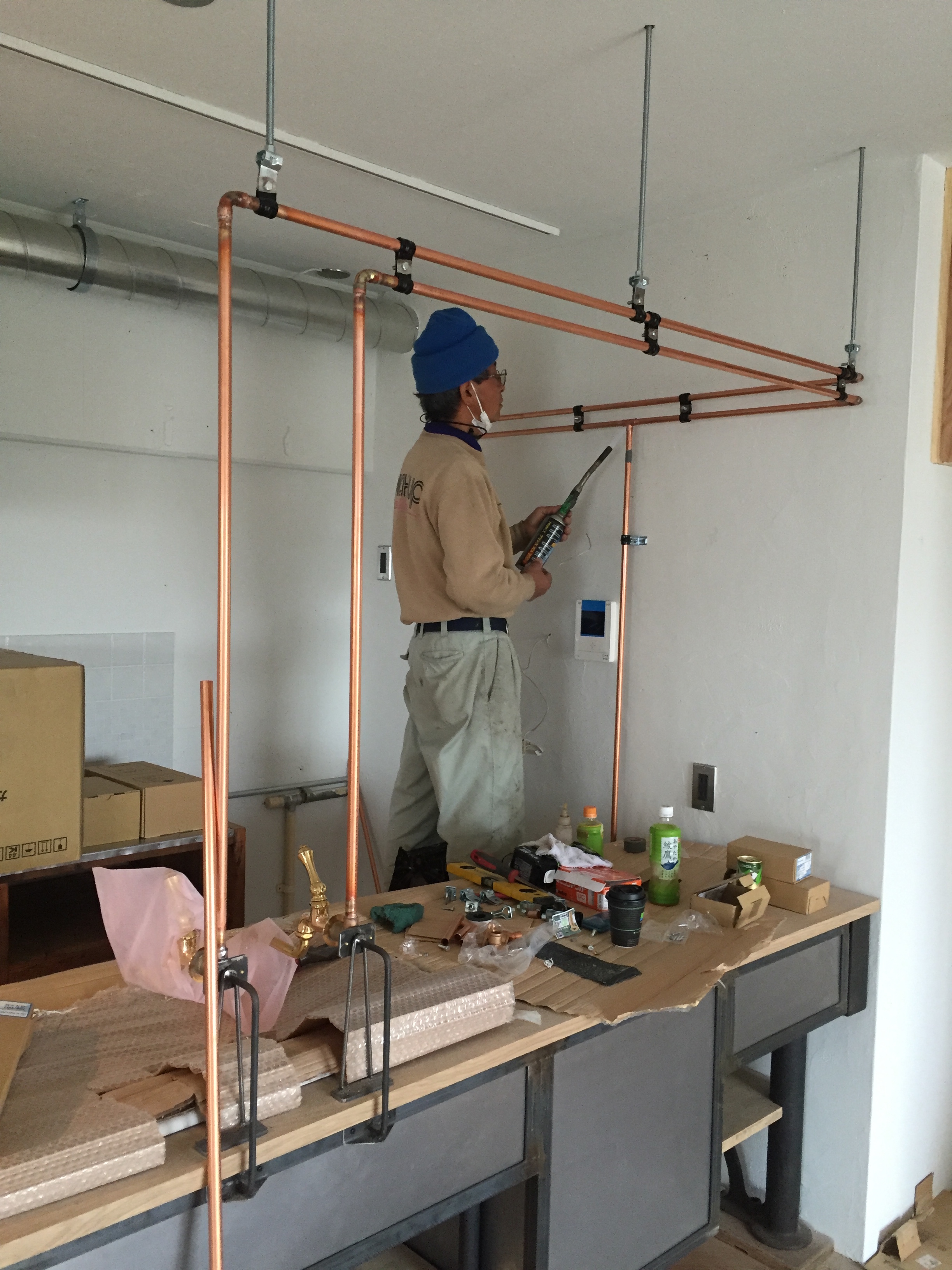 アパートメントストアーの時もお世話になった、下田さん。キッチンに繋がる露出配管を丁寧に仕上げてくださりました。