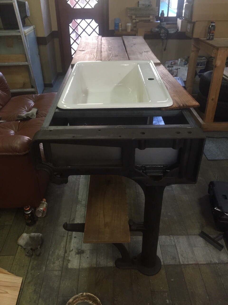鋳物のワークベンチの脚を使ったキッチンもできてきました。