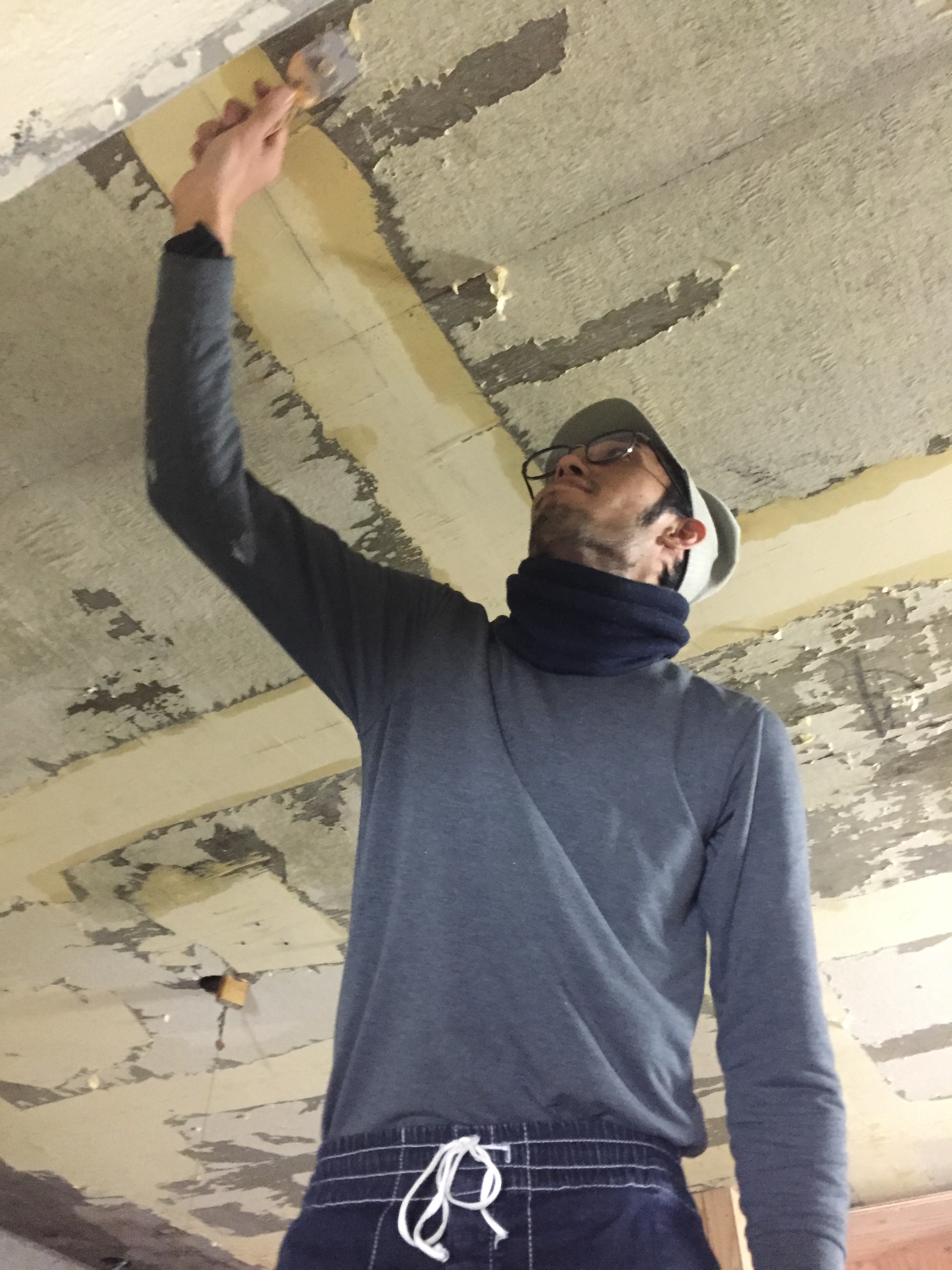 床を貼り終え、大工仕事にめどの立ってきた自宅では、仕事終わりのスタッフに無理を言って、深夜の塗装作業。