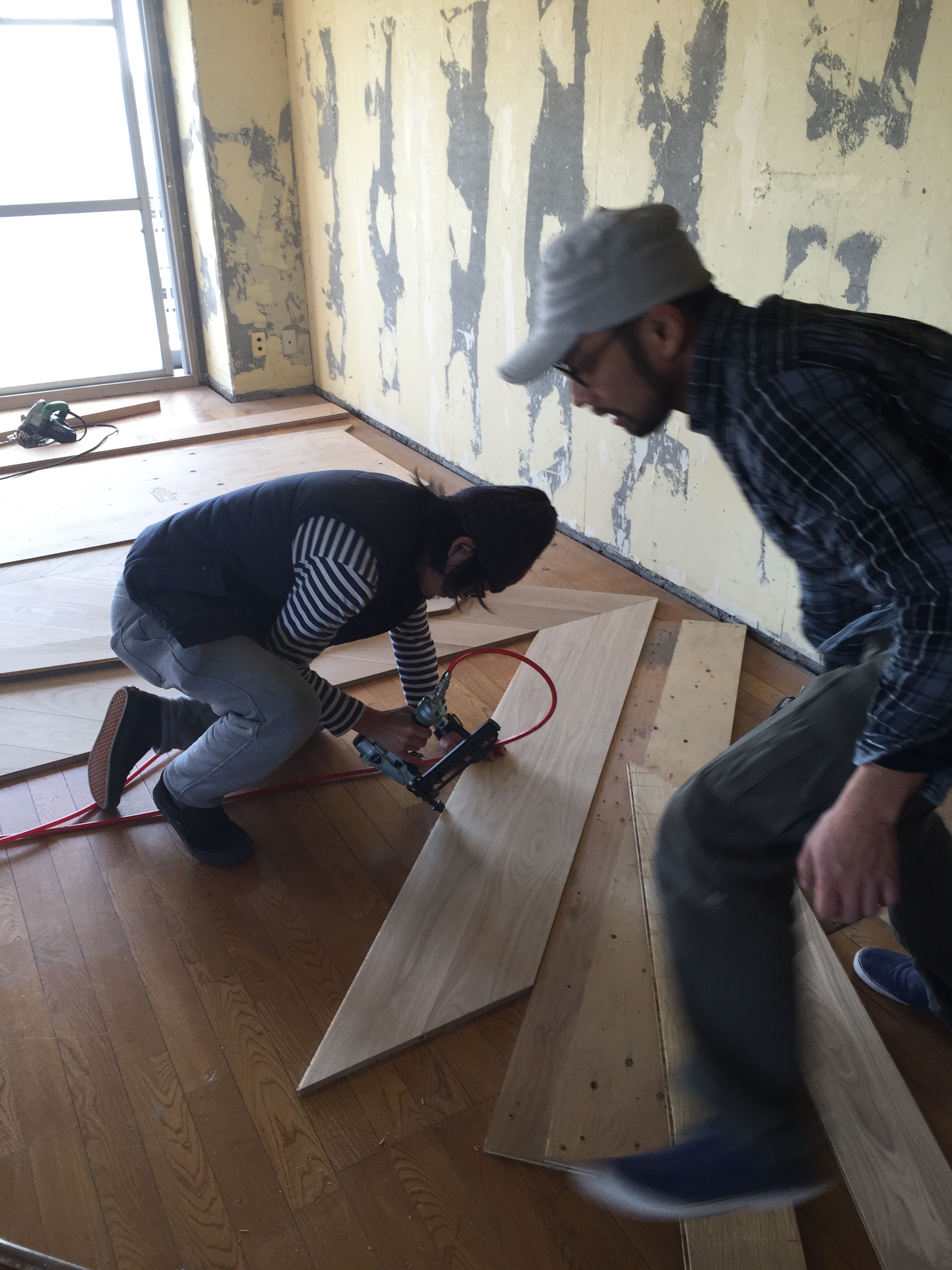 悩みに悩んだ末、床のパターンが決まりました。。。いつも辛い時に助けてくれる ” sacco ” の酒匂くんが現場に入ってくれたことで、何とか工期を変えずに進めることができました。