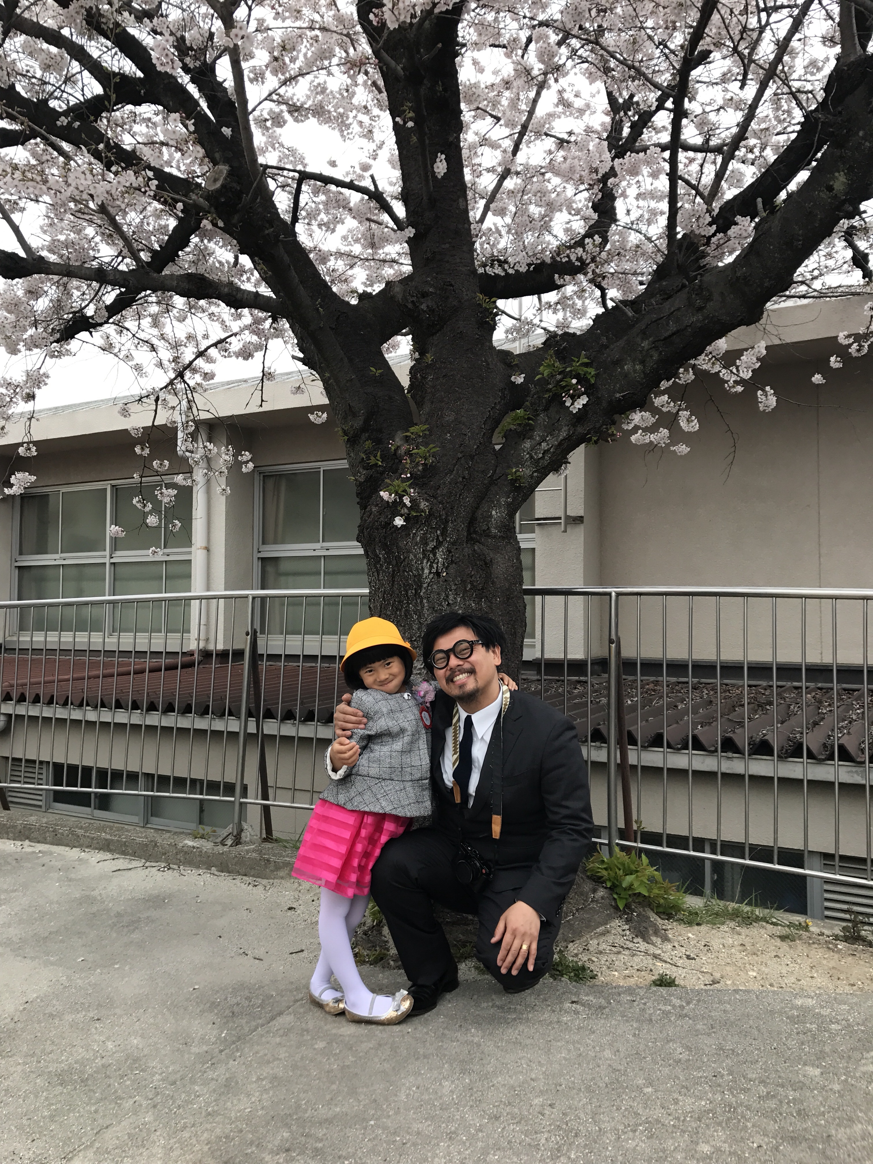 満開の桜の中、長女の入学式で記念撮影。