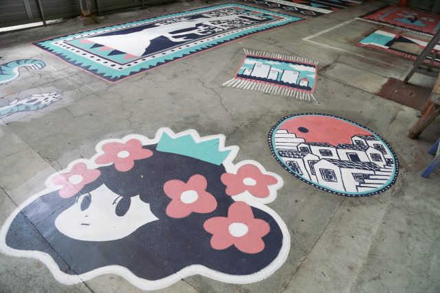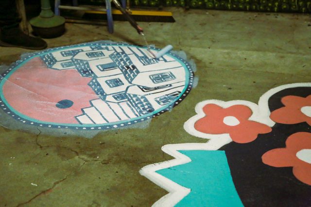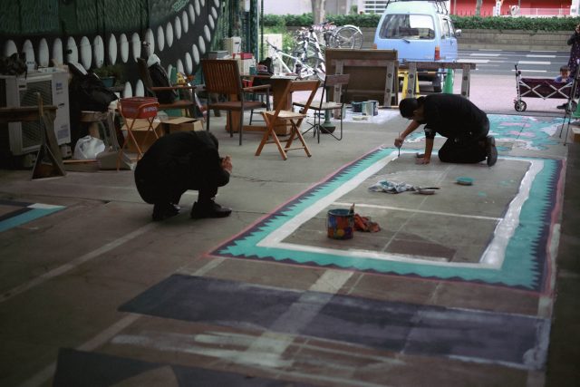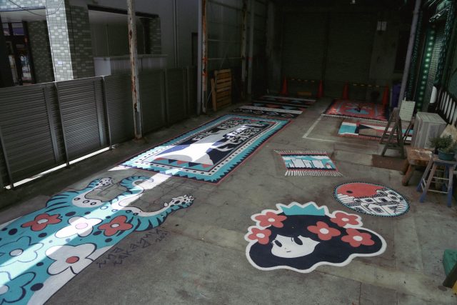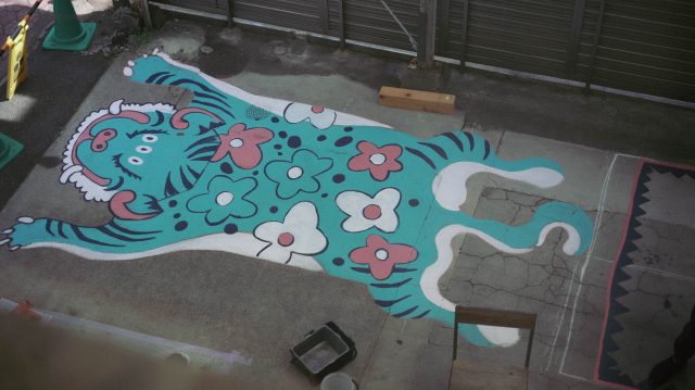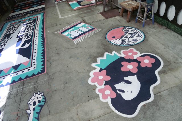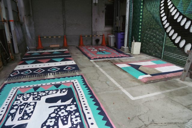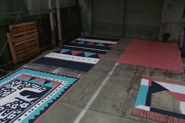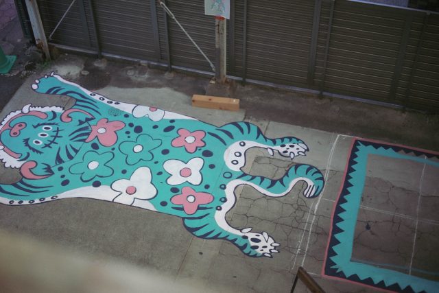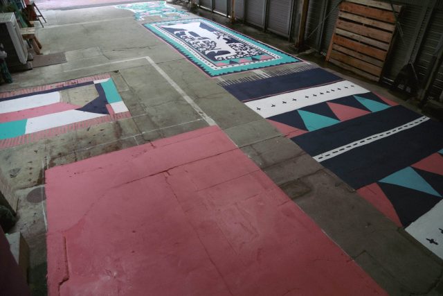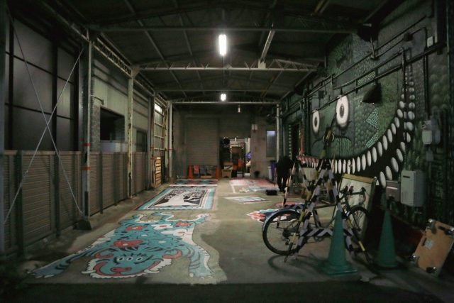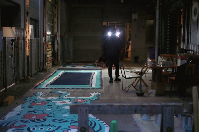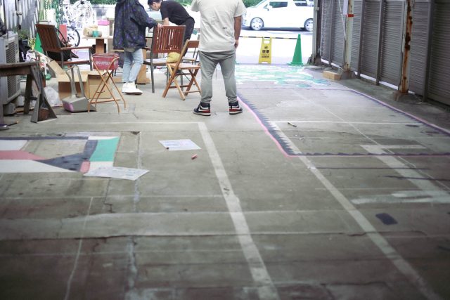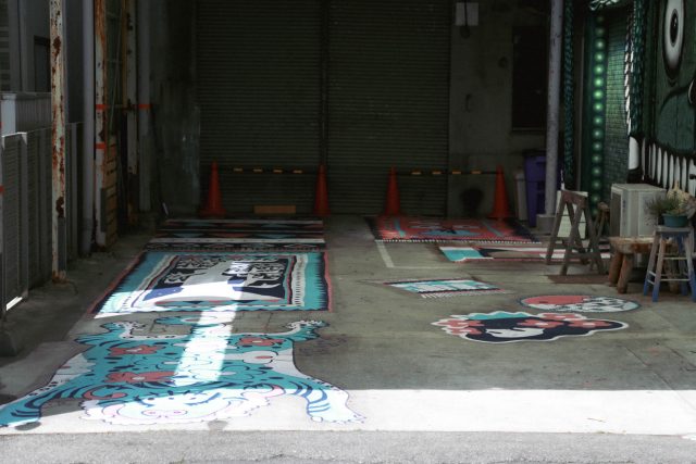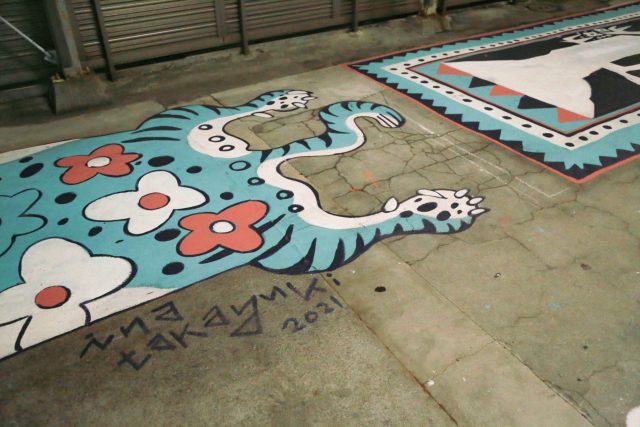 その後、描いていただいた場所が駐車場という事もあり、普段車が停まっている間はイナさんの作品の全貌を観ていただくことが出来ない!ということで、2日間、床画の全体像を観ていただけるように、イナさんのアーカイブ作品も合わせての床画のお披露目会を開きました。