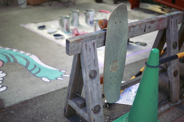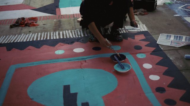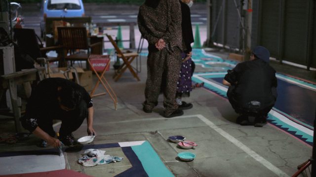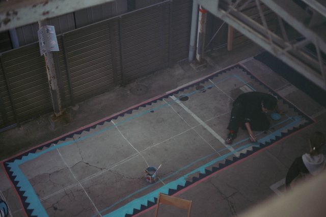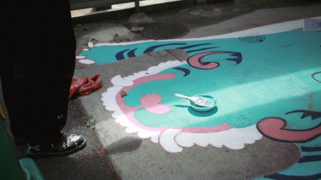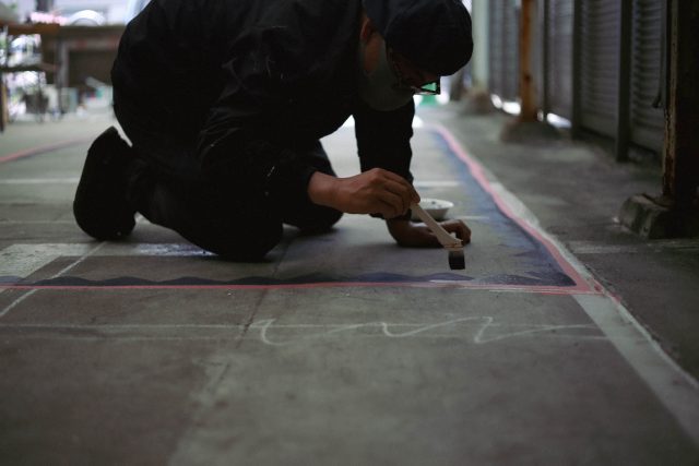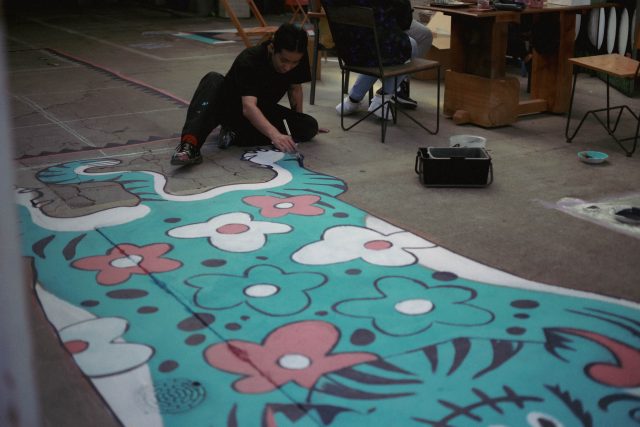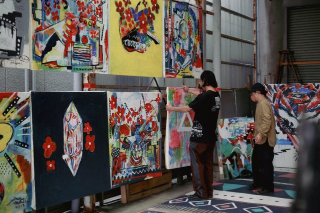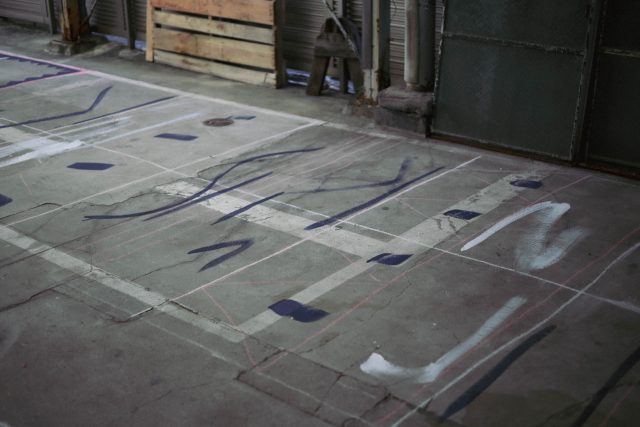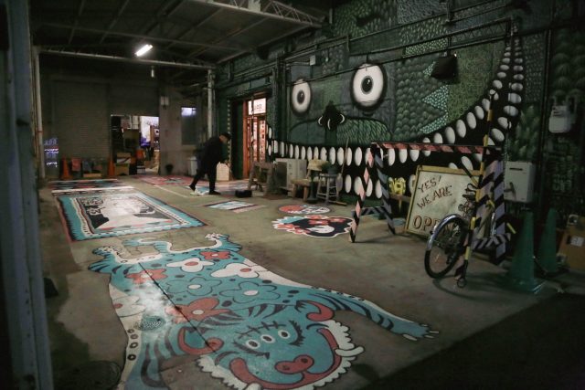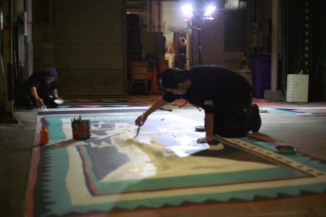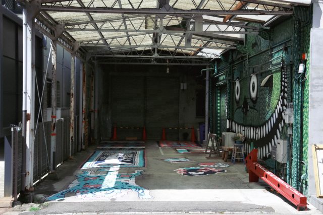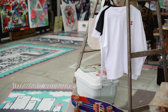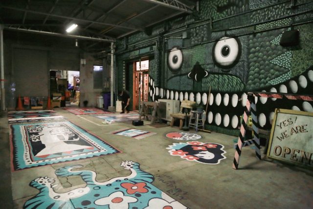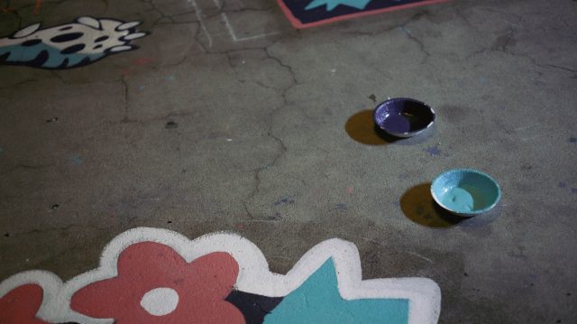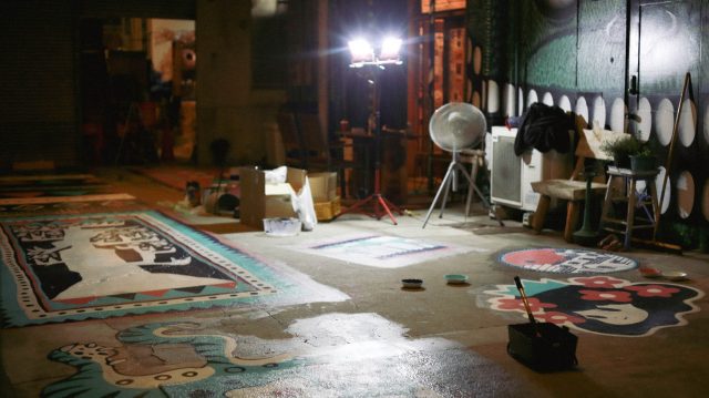 その後、描いていただいた場所が駐車場という事もあり、普段車が停まっている間はイナさんの作品の全貌を観ていただくことが出来ない!ということで、2日間、床画の全体像を観ていただけるように、イナさんのアーカイブ作品も合わせての床画のお披露目会を開きました。