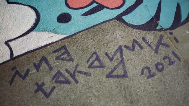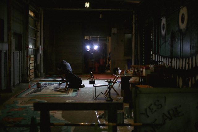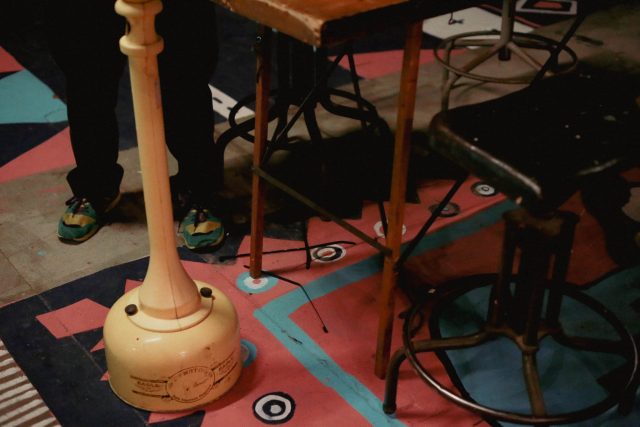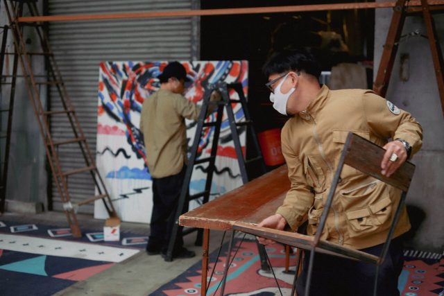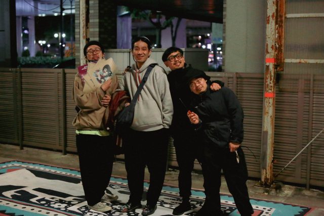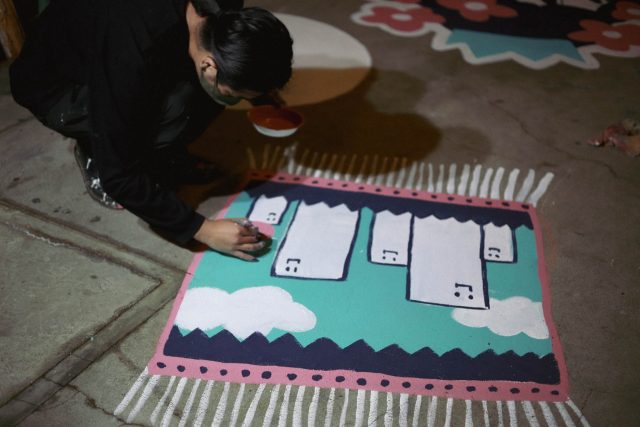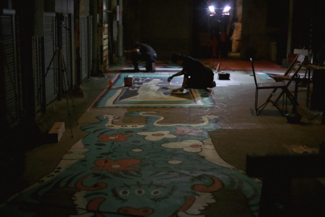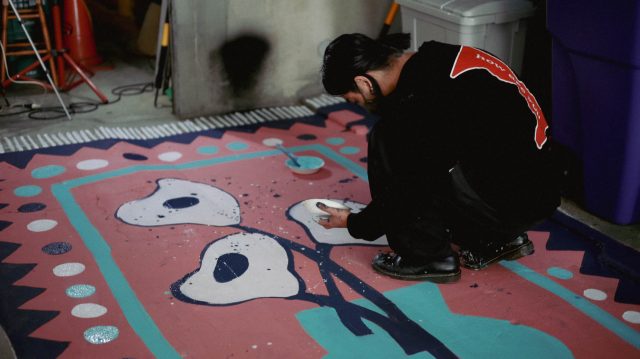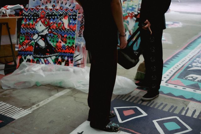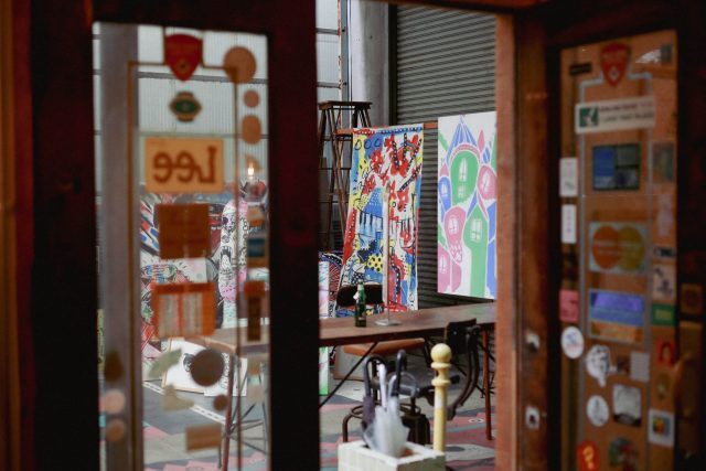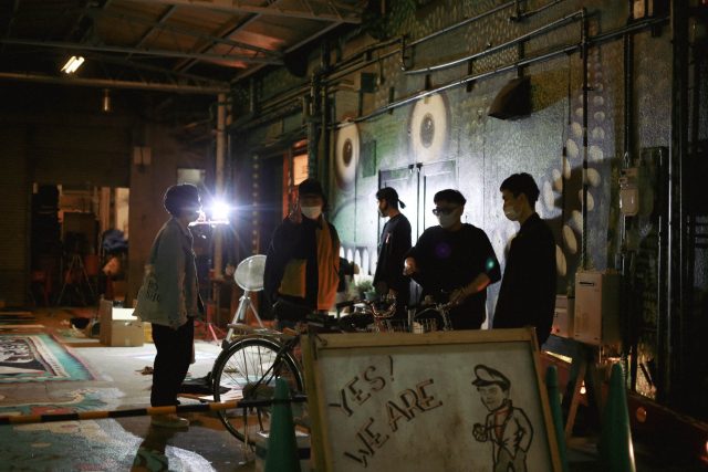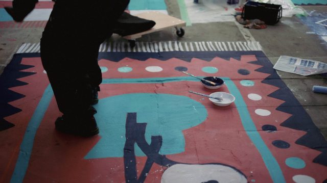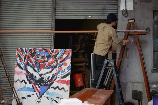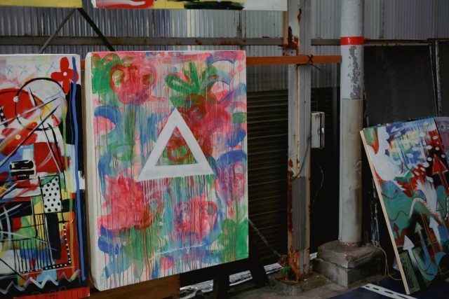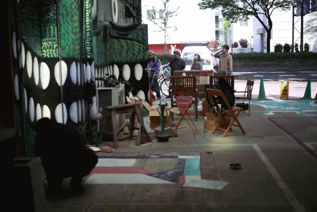 その後、描いていただいた場所が駐車場という事もあり、普段車が停まっている間はイナさんの作品の全貌を観ていただくことが出来ない!ということで、2日間、床画の全体像を観ていただけるように、イナさんのアーカイブ作品も合わせての床画のお披露目会を開きました。