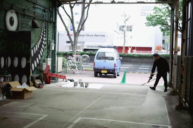 そして、随分ブログの更新までに日が空いてしまいましたが、今年の4月にSTORE IN FACTORYと姉妹店のTHE APERTMENT STOREが入る、栄5丁目のビル駐車場にina takayukiさんに新たに床画を描いていただいたのでその様子をご紹介です。
