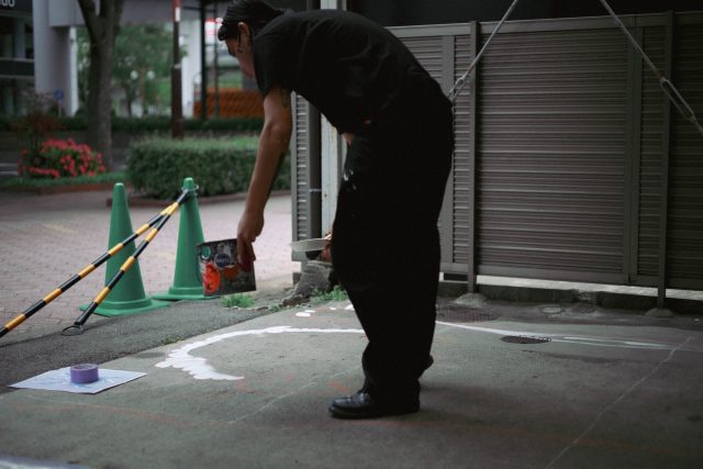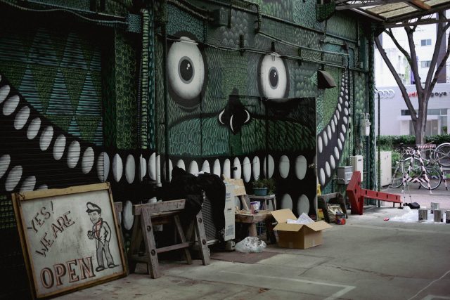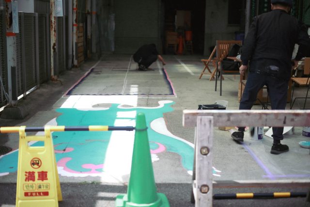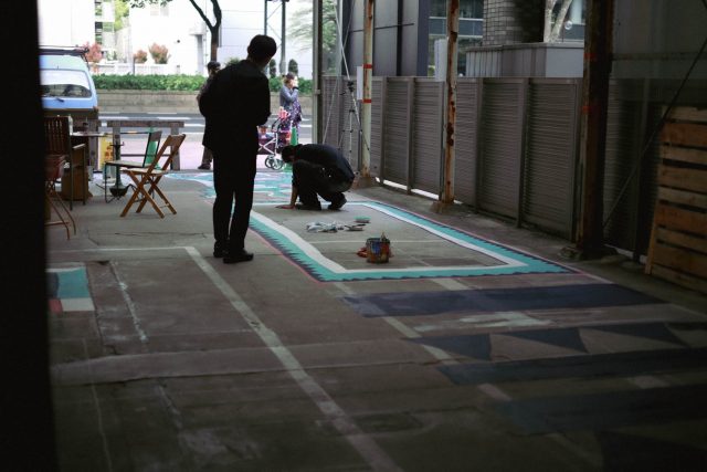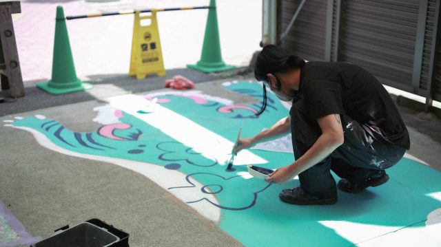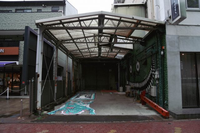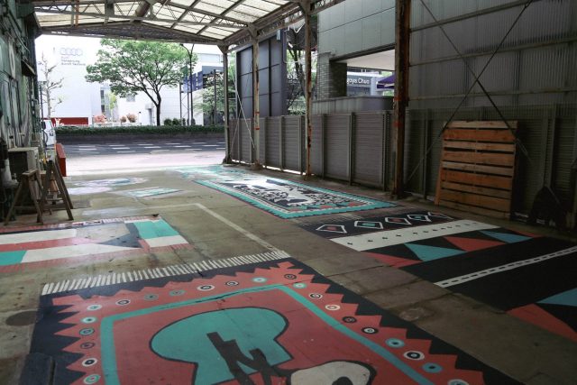 今回床画を描いていただいた場所は、もうすっかりこのビルの “ 顔 ” となった、yoshi47さんの壁画がある駐車場床面。