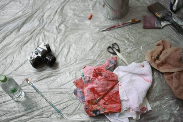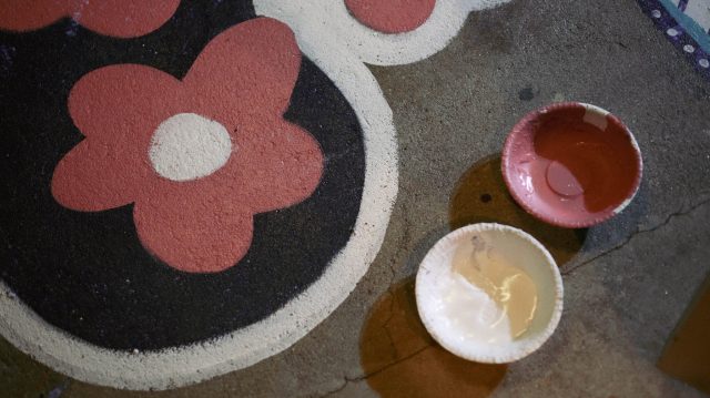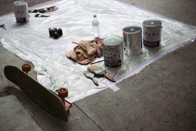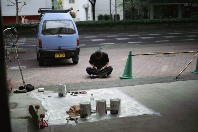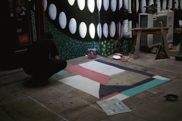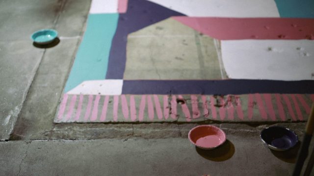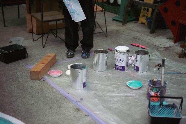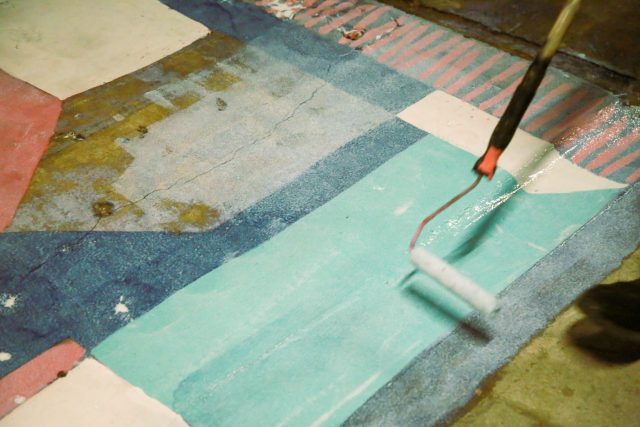 朝から夜遅くまで、ずっと膝をつく姿勢で床へのペイントは重労働。