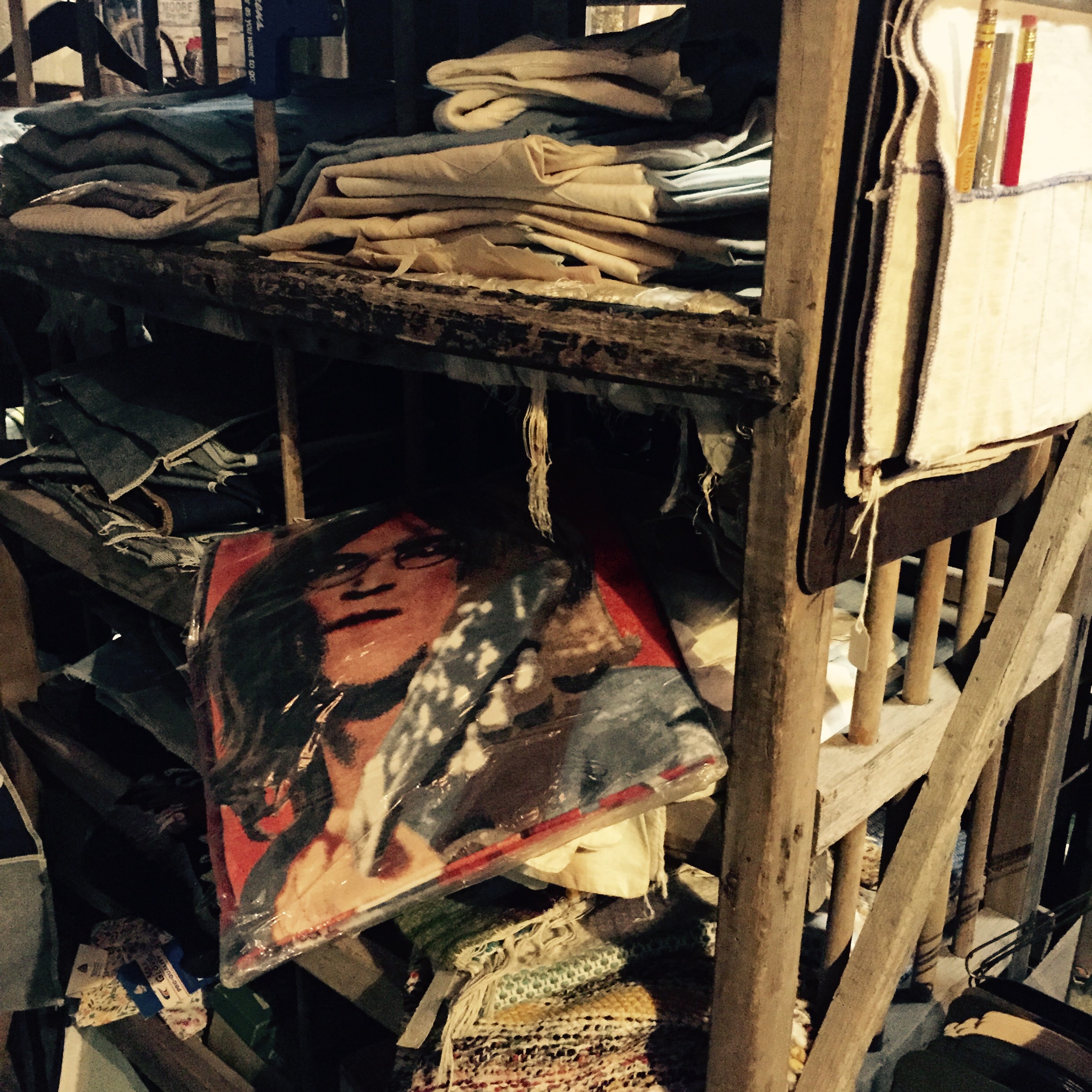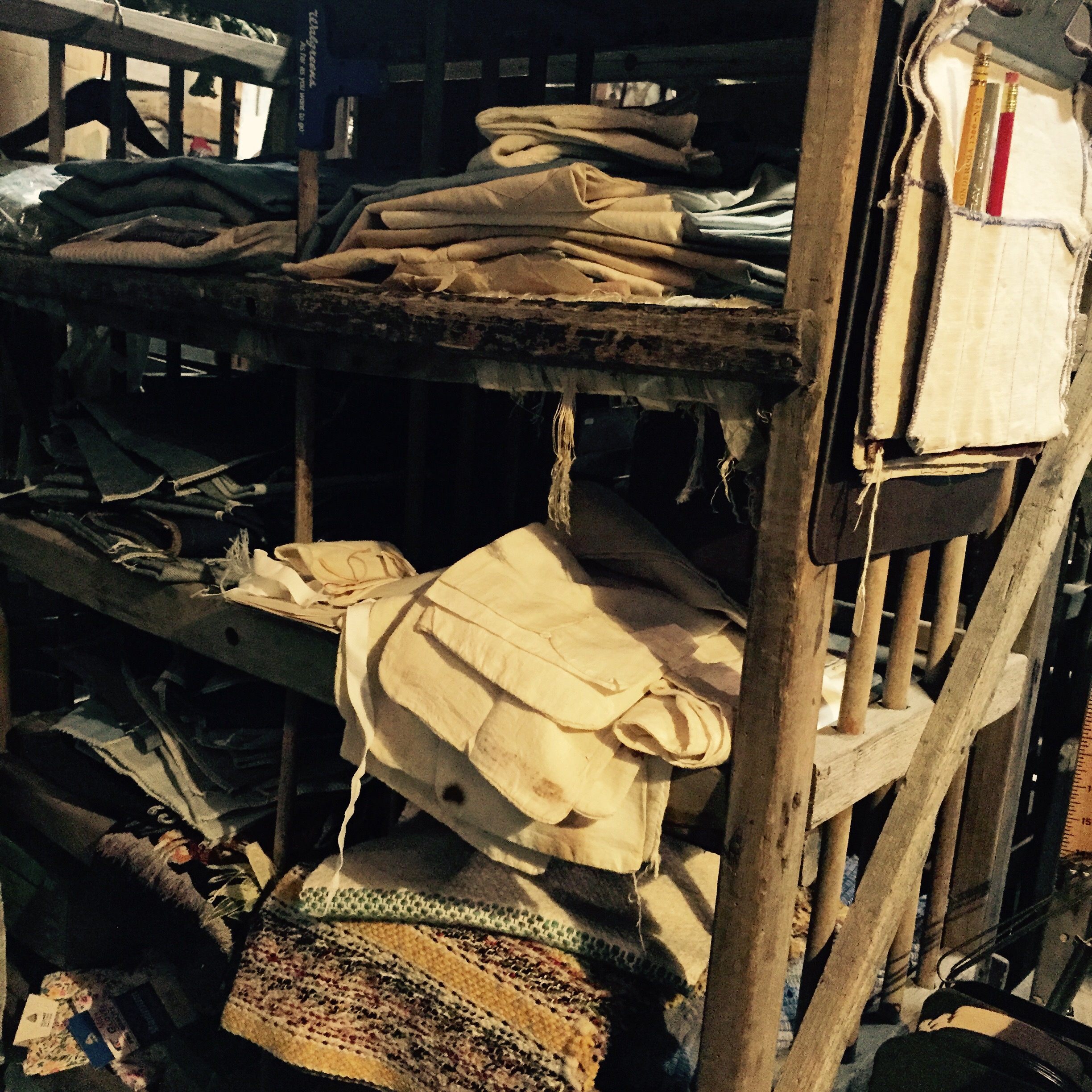 続いては、古いシューズラックの中。デニムのエプロンや、ワークシャツ、布、小さなラグなどが詰まっています。