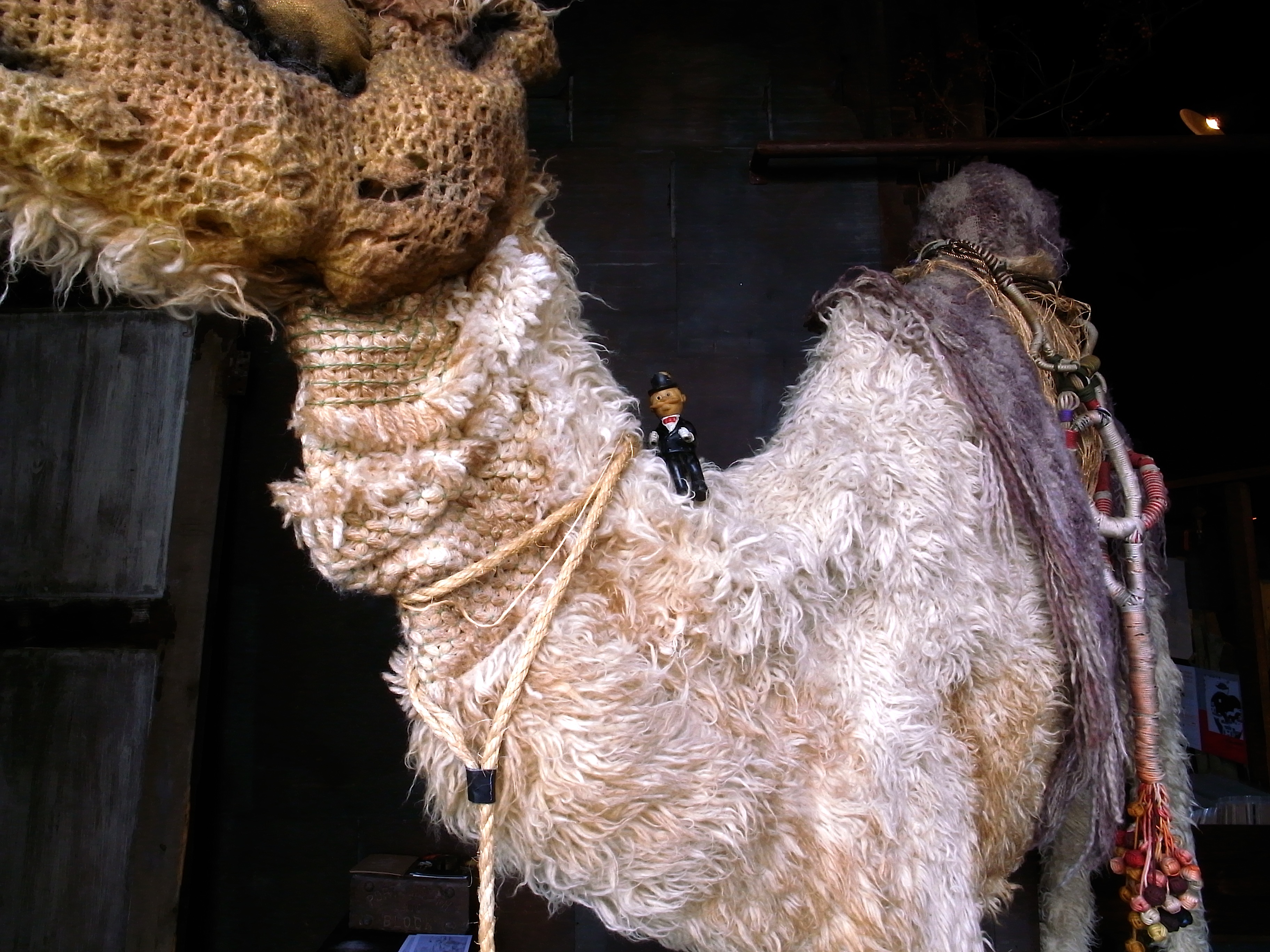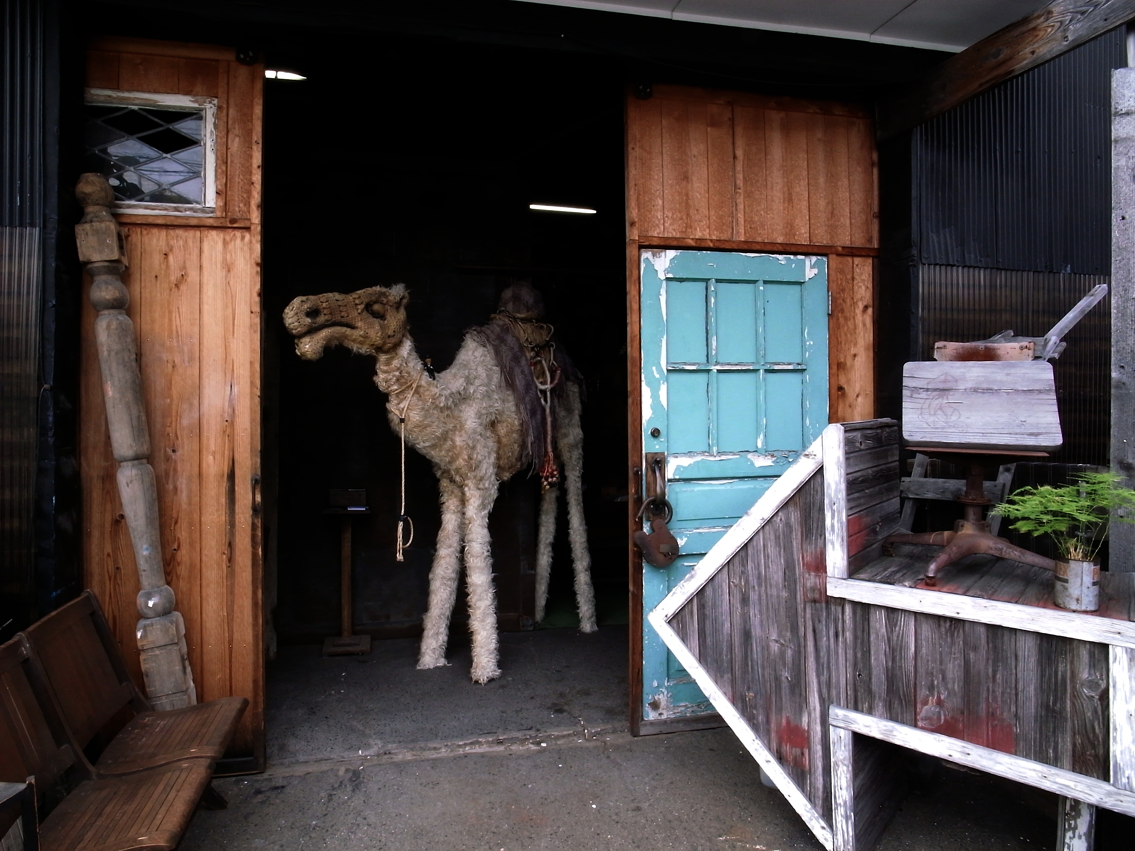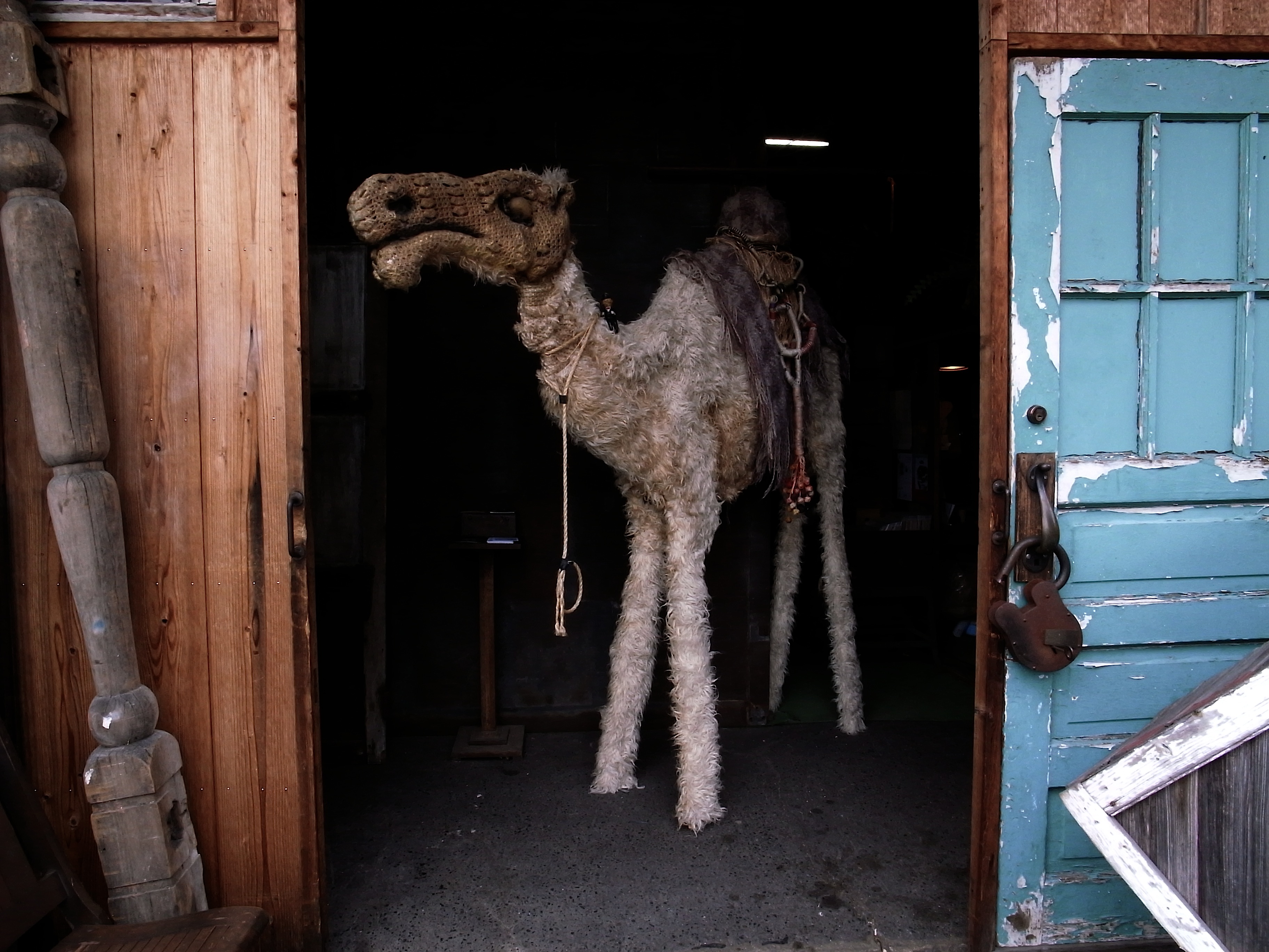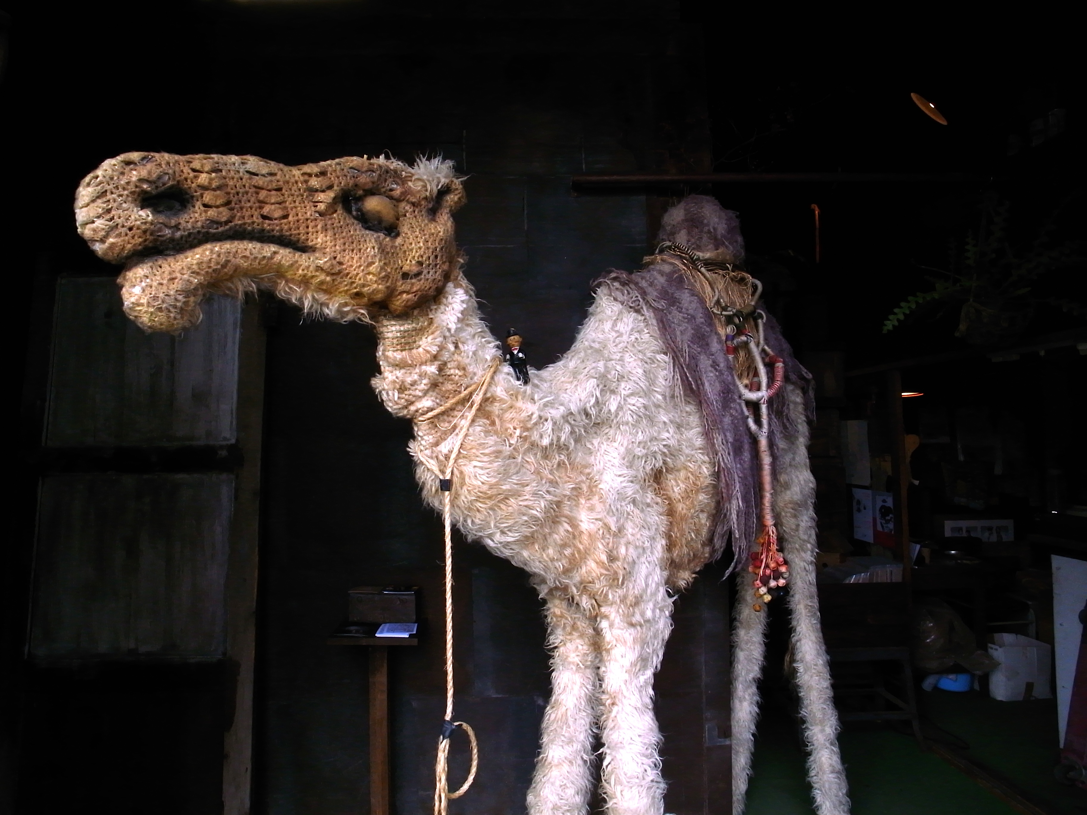 入り口にそびえ立つらくだ君、前の道を通る人も気にされています。