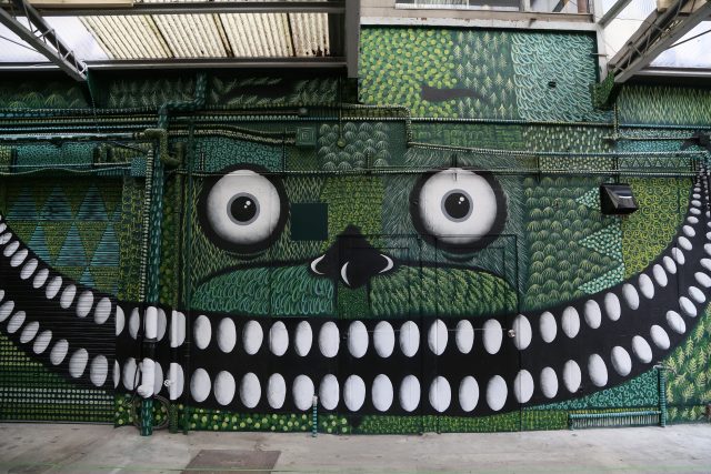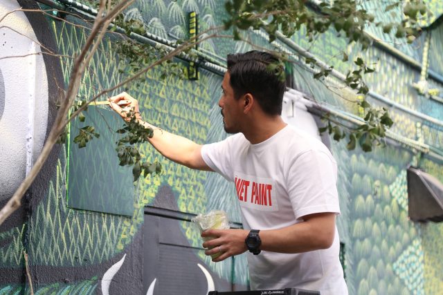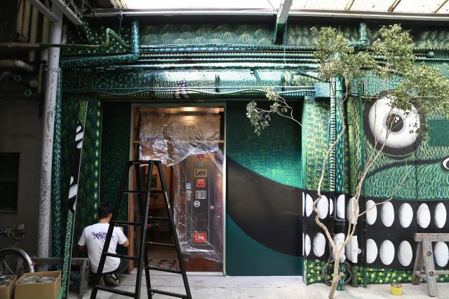 その日、外では、文字通りこのビルの” 顔”でもあるモンスターの壁画を、アーティストのyoshi47さんが仕上げて下さっていました。