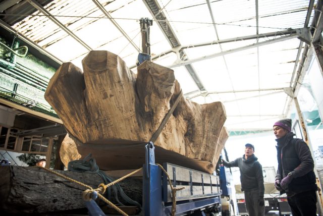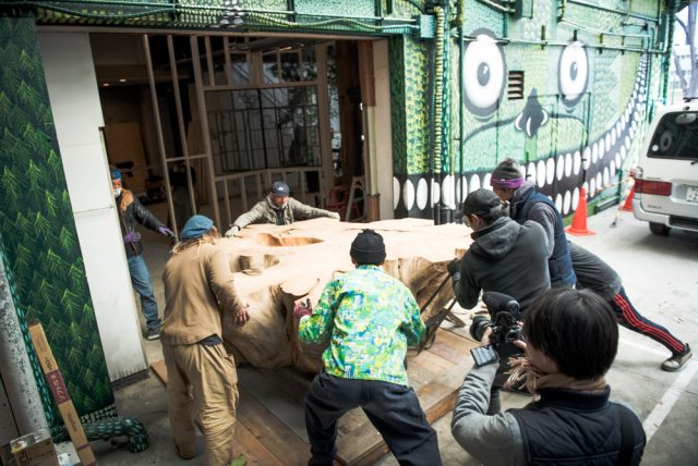 そこから、まだカフェ側の壁を作る前に、この特大テーブルを、見城さん達の力を借りつつ店内へ。