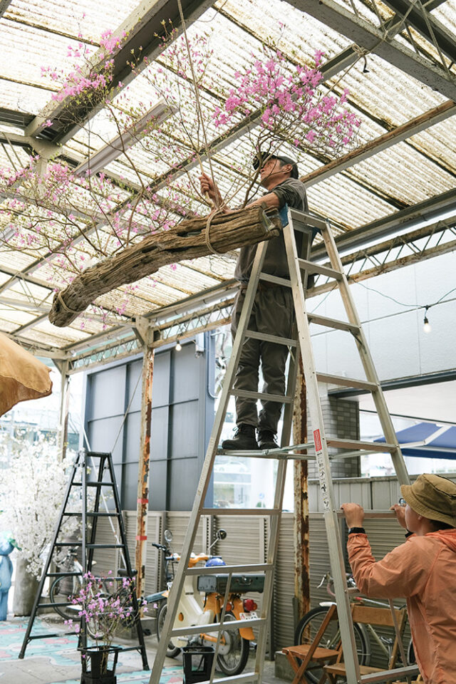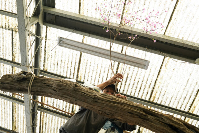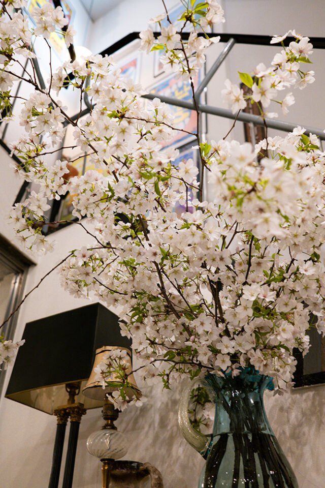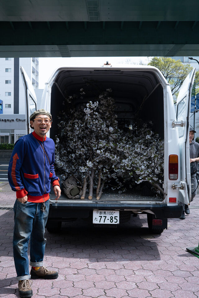 朝、ファクトリーへ到着した見城さんの車を開けると花をたくさんつけた桜の枝が!