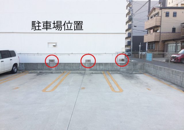 ↓ 上の地図中の①・②・③に当たる位置です!(白い4階建ての建物裏)