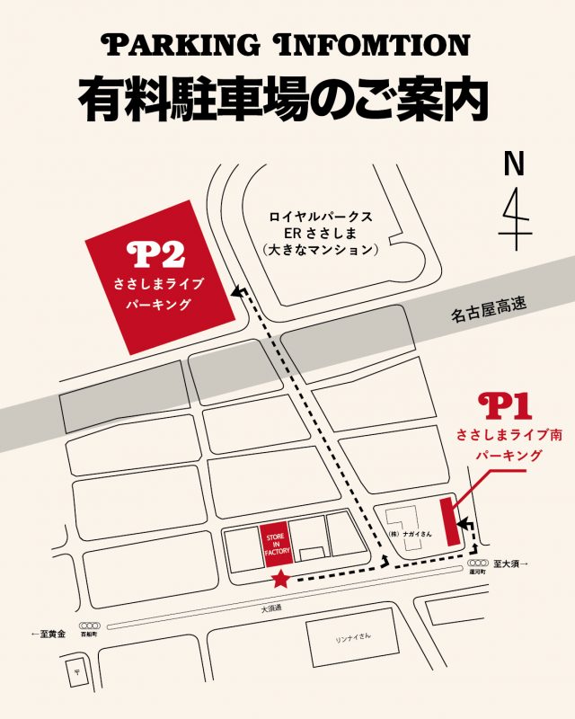 STORE IN FACTORYの専用駐車場5台分が満車の場合は、近隣の有料駐車場への駐車のご協力をよろしくお願いいたします。