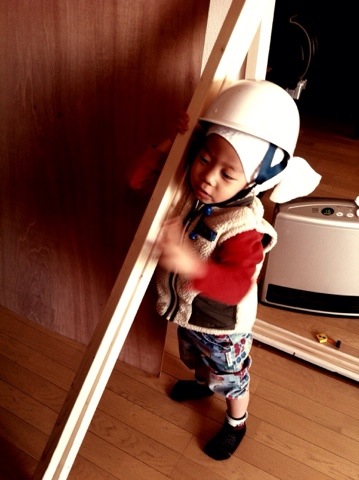 お休みの日には、壁に開いてしまった穴ポコを、黒板にしてしまおうと、長男の市丸と大工仕事をしました。