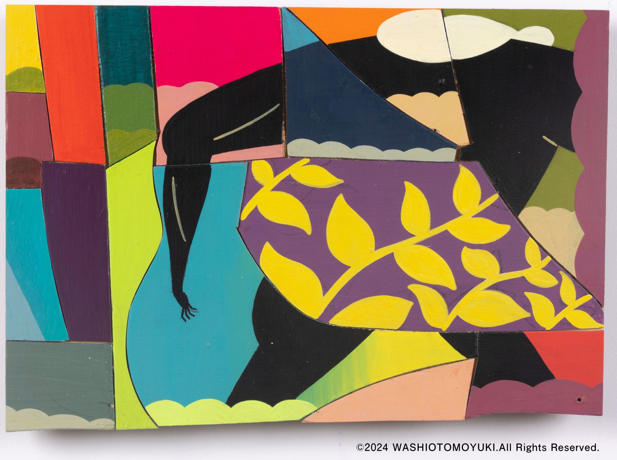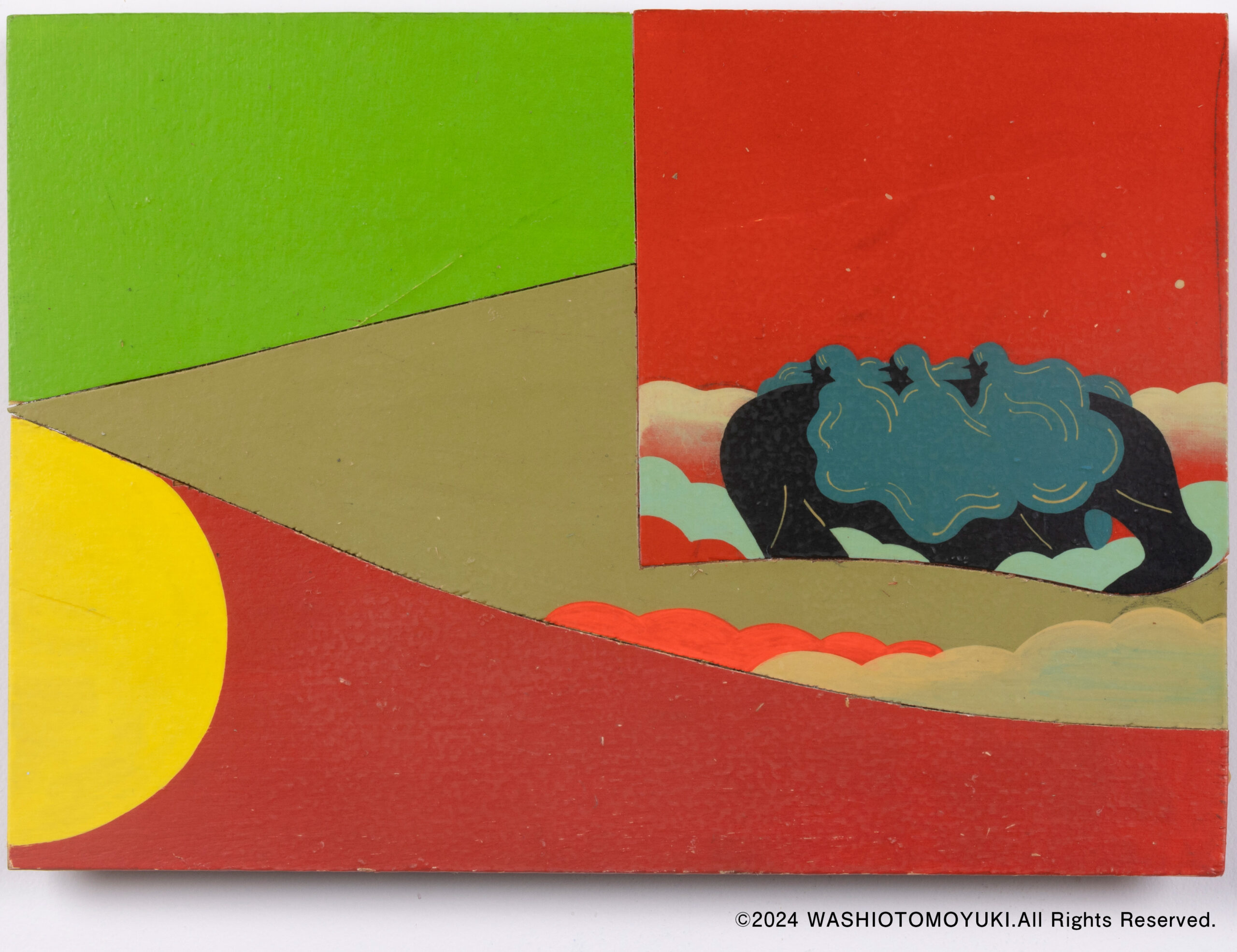 木の端材をパッチワークで紡ぎ合わせた上に着彩。