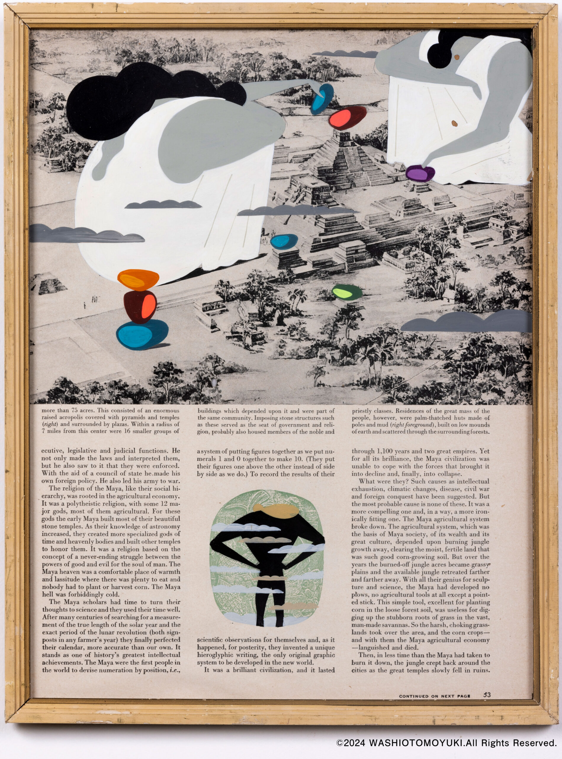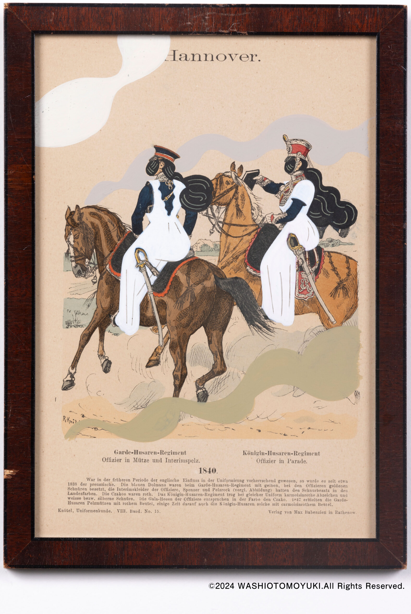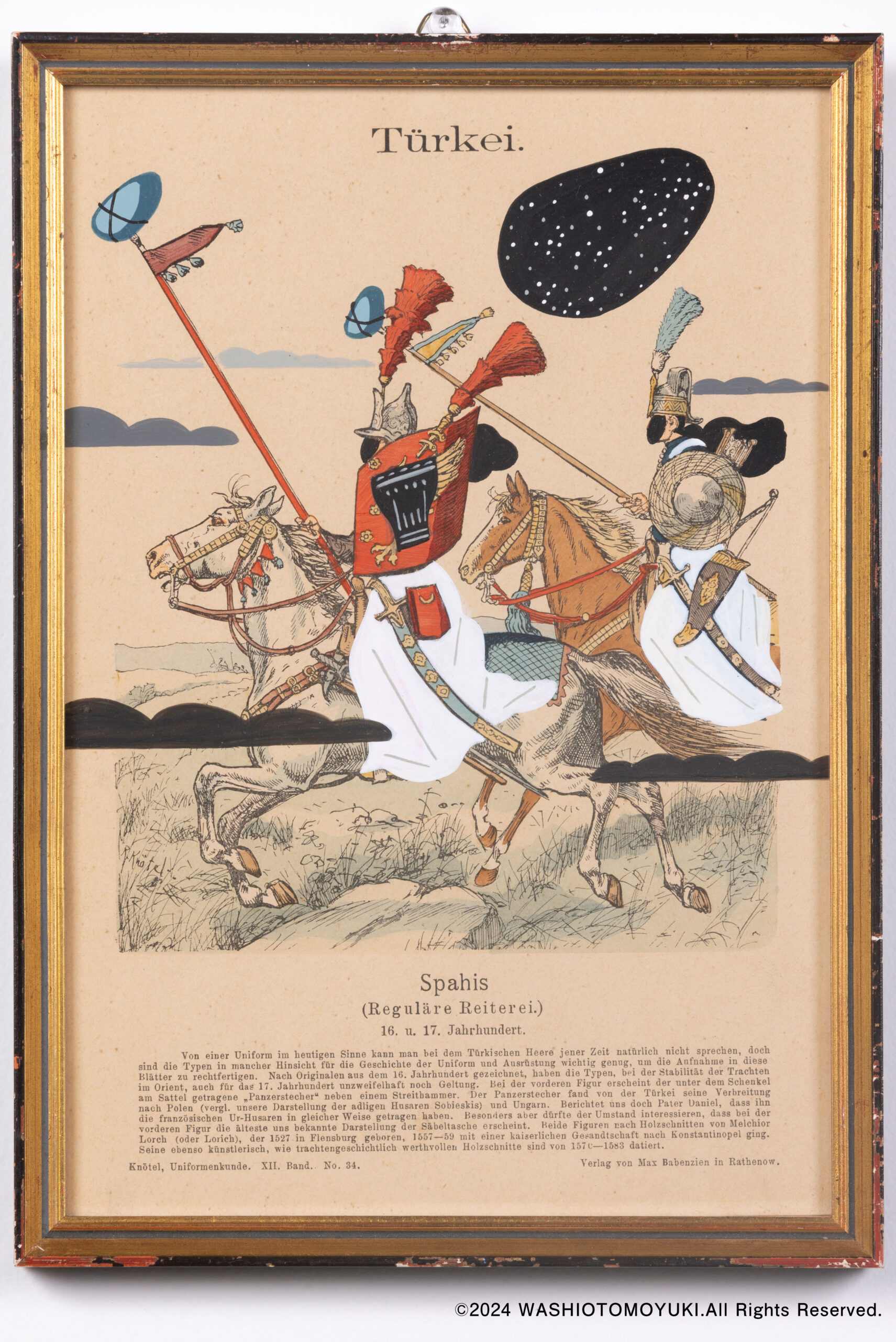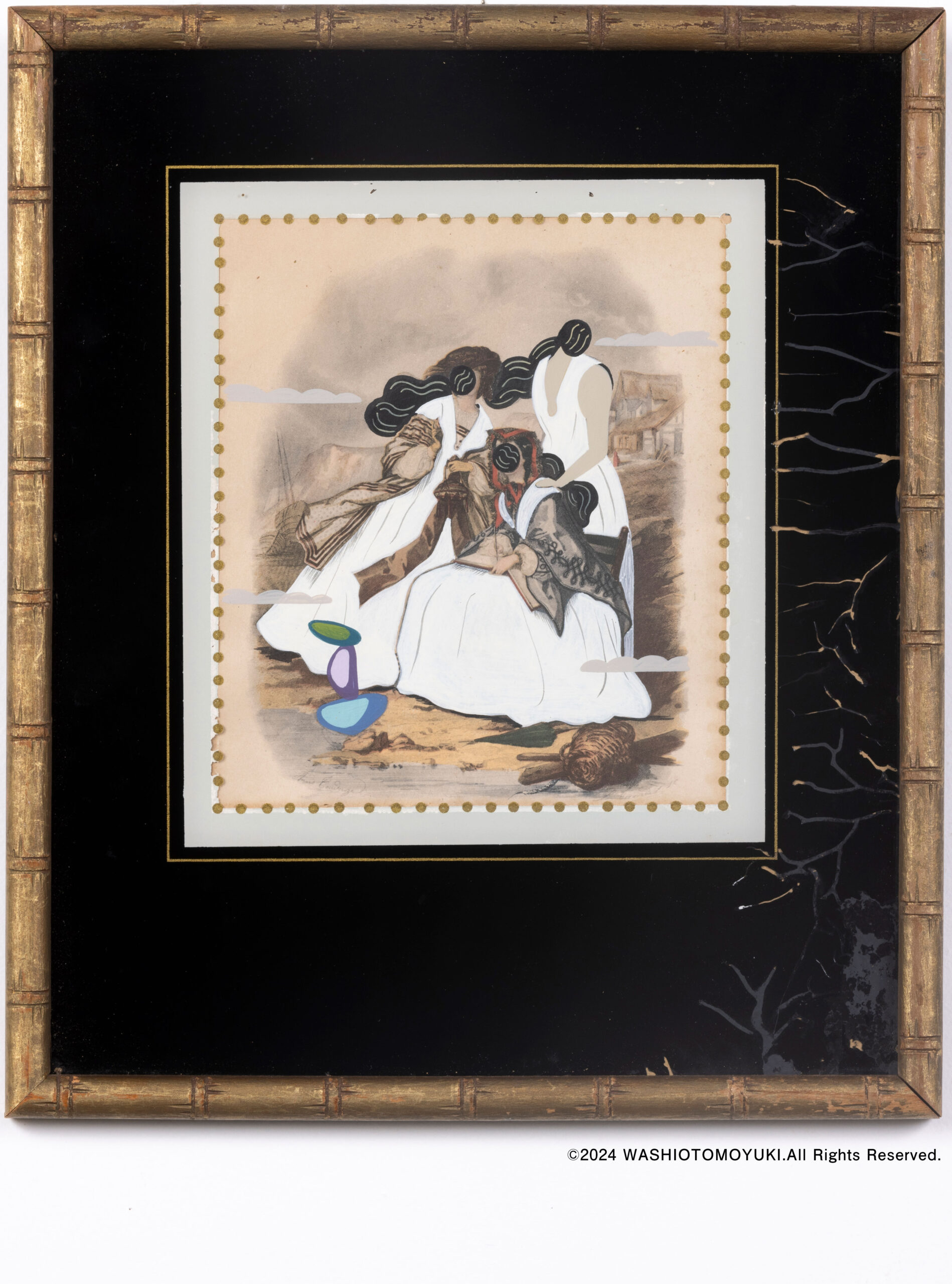 遠く海外から長い年月を経てやってきた古紙に独自のタッチで絵を描き乗せた作品。