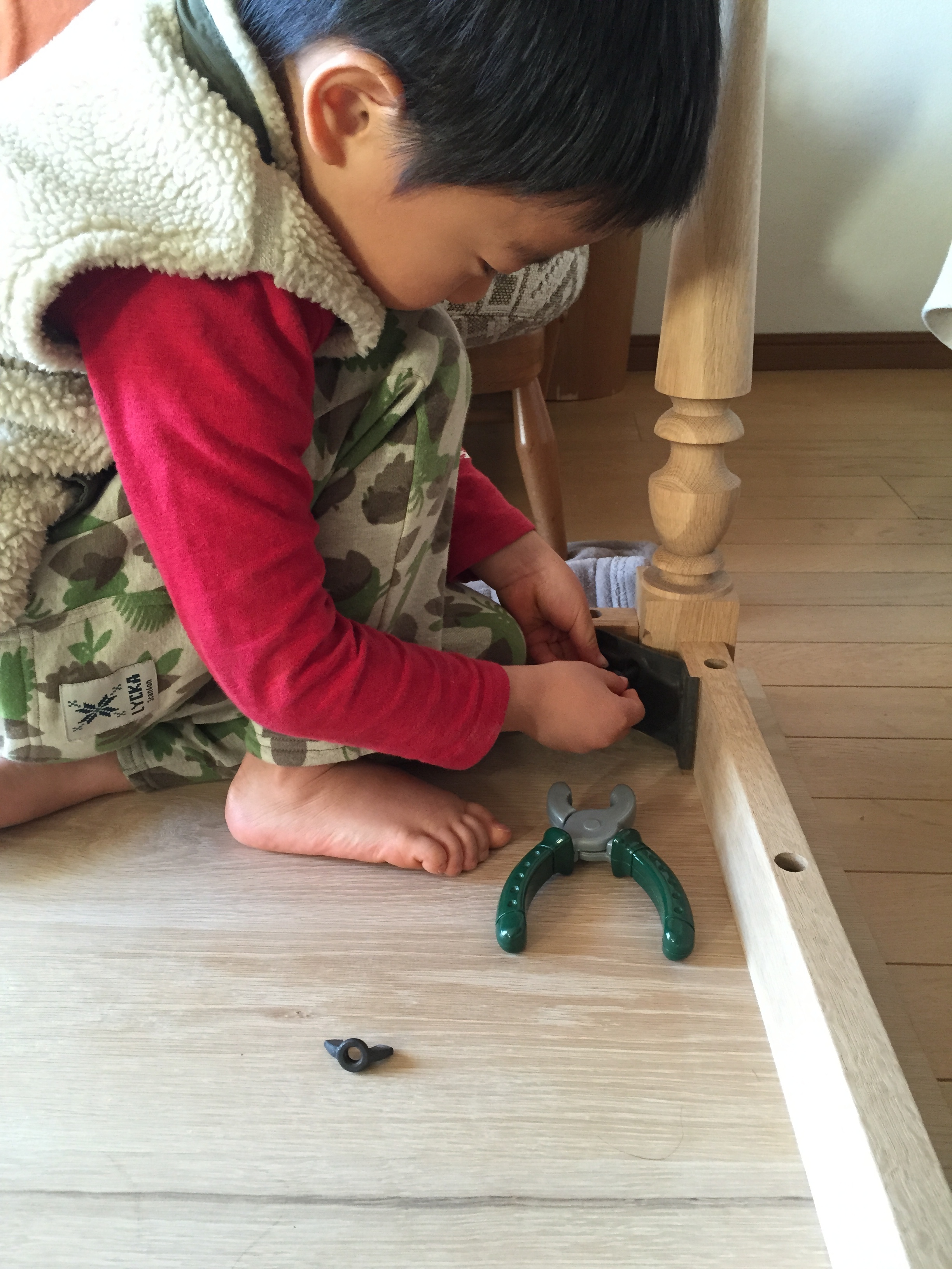 お休みの日には、僕たちの製作所の studio truss と 岡崎にできた家具屋さん CARAVAN FURNITURE さんとの共同製作の家具の試作を自宅に設置するため、長男と組み立てをしました。
